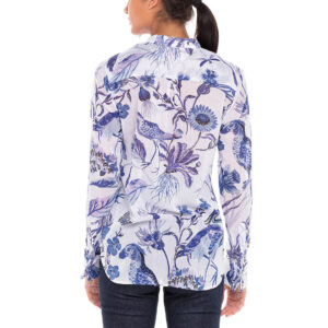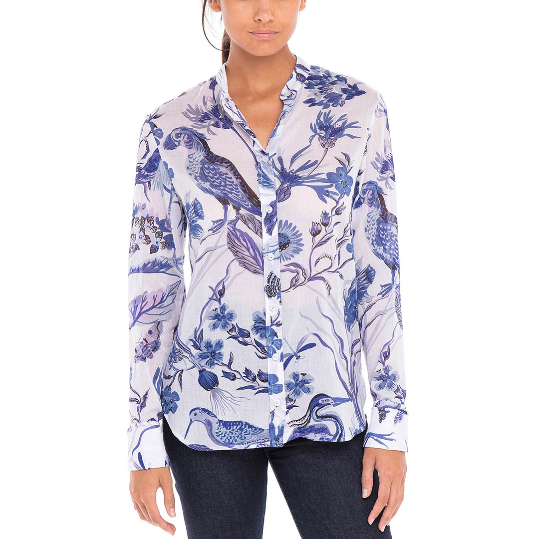 Inspirada en la infancia del diseñador en el norte de Gales en la década de 1970, la camisa Alfreda está confeccionada con un estampado vibrante de pájaros y plantas.