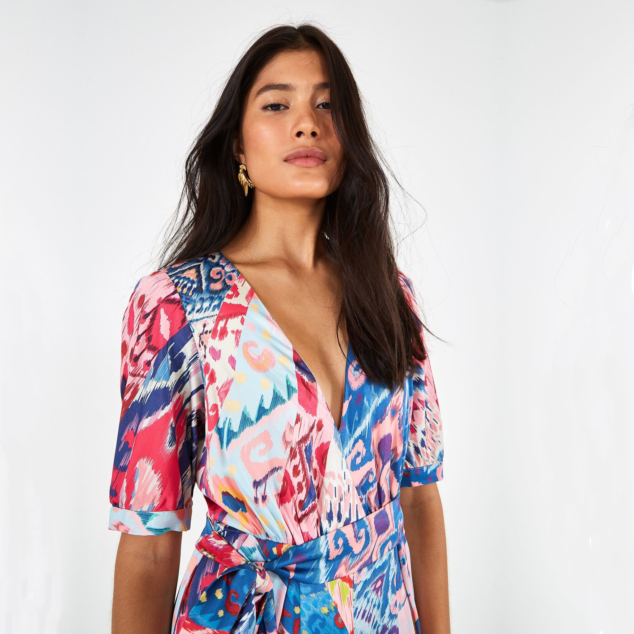 Slim fitting short sleeve jumpsuit with a cropped leg. V neckline. Front pleats. Front pockets. Adjustable waist tie. Cuffed sleeve. Composition 100% VISCOSE Care Instructions HAND WASH WARM;