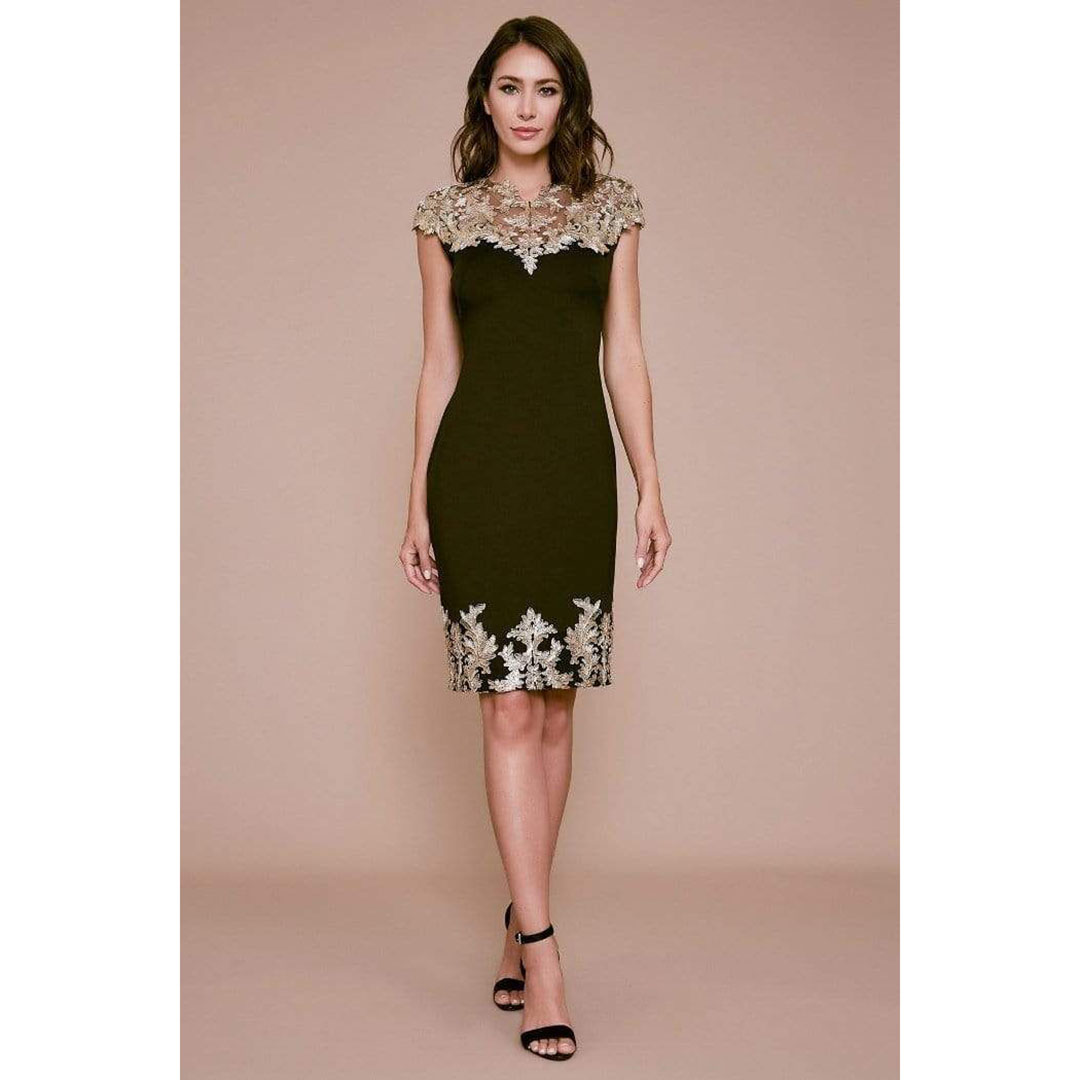 A painterly embroidery accentuates this fitted crepe sheath’s neckline illusion and above-the-knee hemline. Center back invisible zipper.
