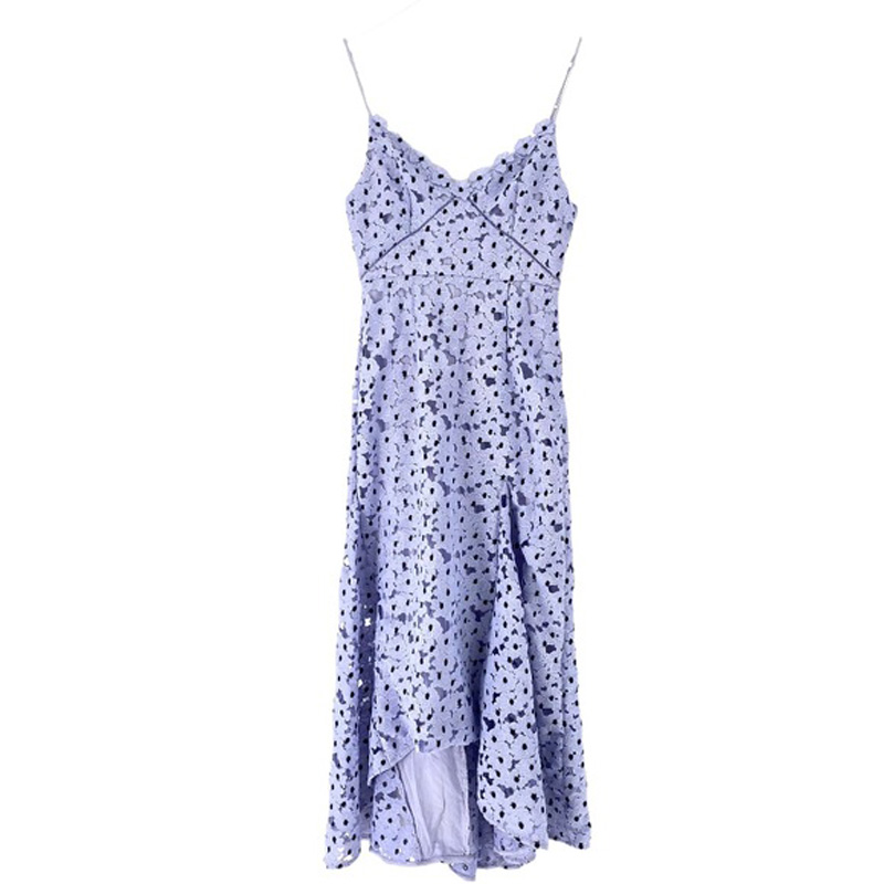 Women’s Lucy Lace Floral Midi Dress by Sau Lee in Blue. Lucy is a staple cocktail dress with a floral daisy motif. It features a fitted bodice with adjustable spaghetti straps and an asymmetric midi skirt with semi-sheer lace panels at the front and back.