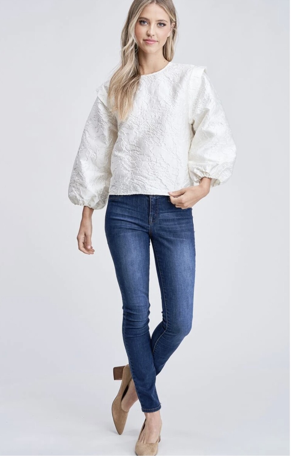 This jacquard ivory blouse is elegant and of-the- moment. Puffed, structured sleeves and body add to a looser fit. Pair with skinny black jeans and you are ready for a night out.