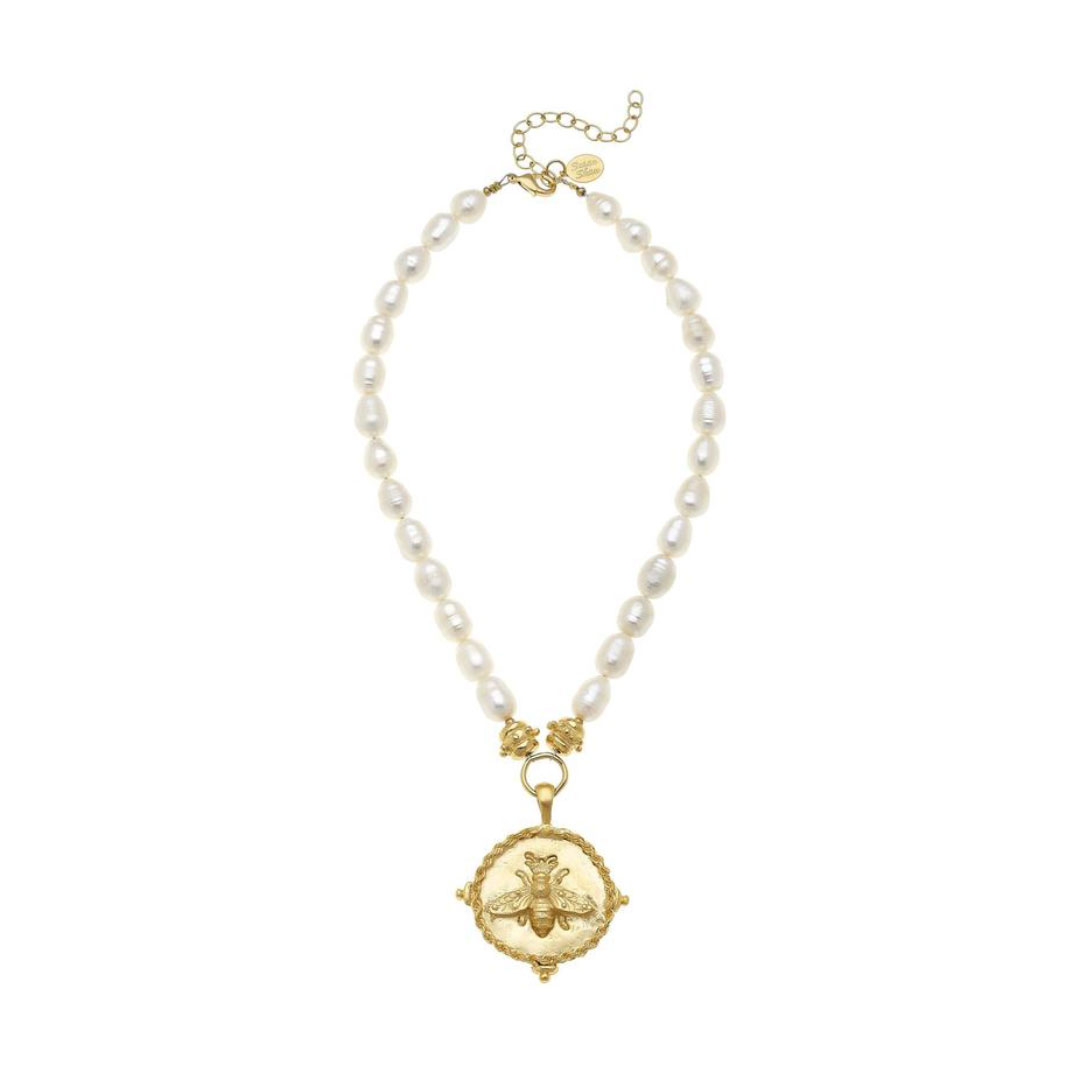 Gold Bee Pendant on Genuine Freshwater Pearl Necklace, 16 inches with a 3 inch Extender Chain, Handcast 24Kt Gold Plated, Handmade in San Antonio, TX
