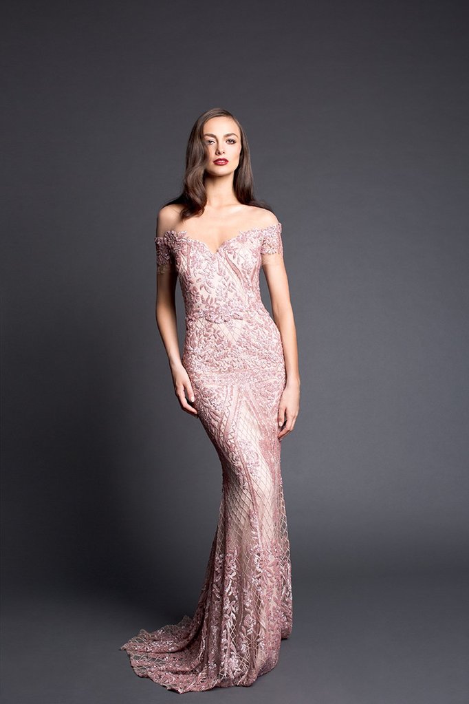 Elegant off-the-shoulder neckline embellished sheath dress by Nicole Bakti
