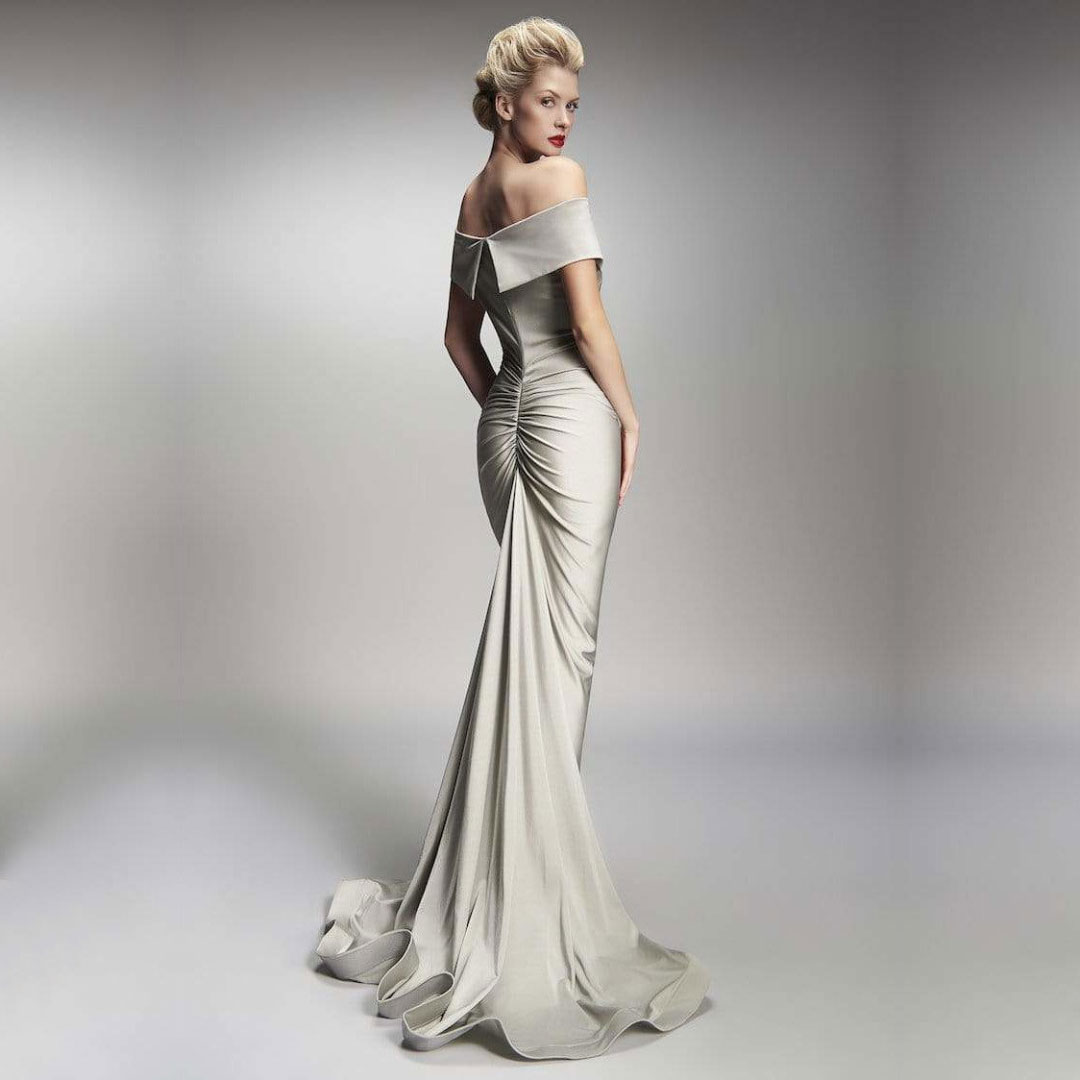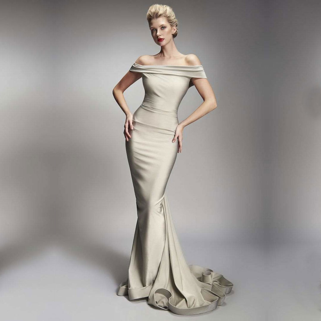 Luxurious off the shoulders fitted dress with back rushing.