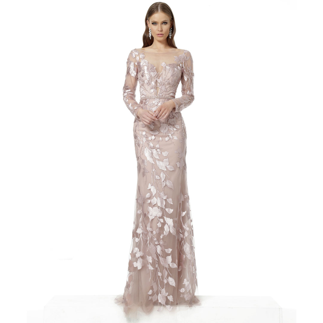 Light purple embroidered tulle, sheath silhouette, floor length skirt, embellished thin belt at waist, long sleeve bodice, sheer boat neck, V back.