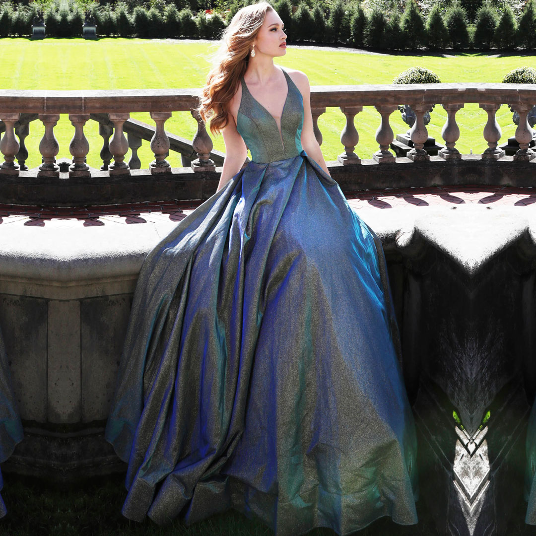 Green and blue metallic glitter prom gown with a plunging mesh insert neckline, sleeveless bodice, and cross strap open back, floor-length A-line pleated and flared skirt.