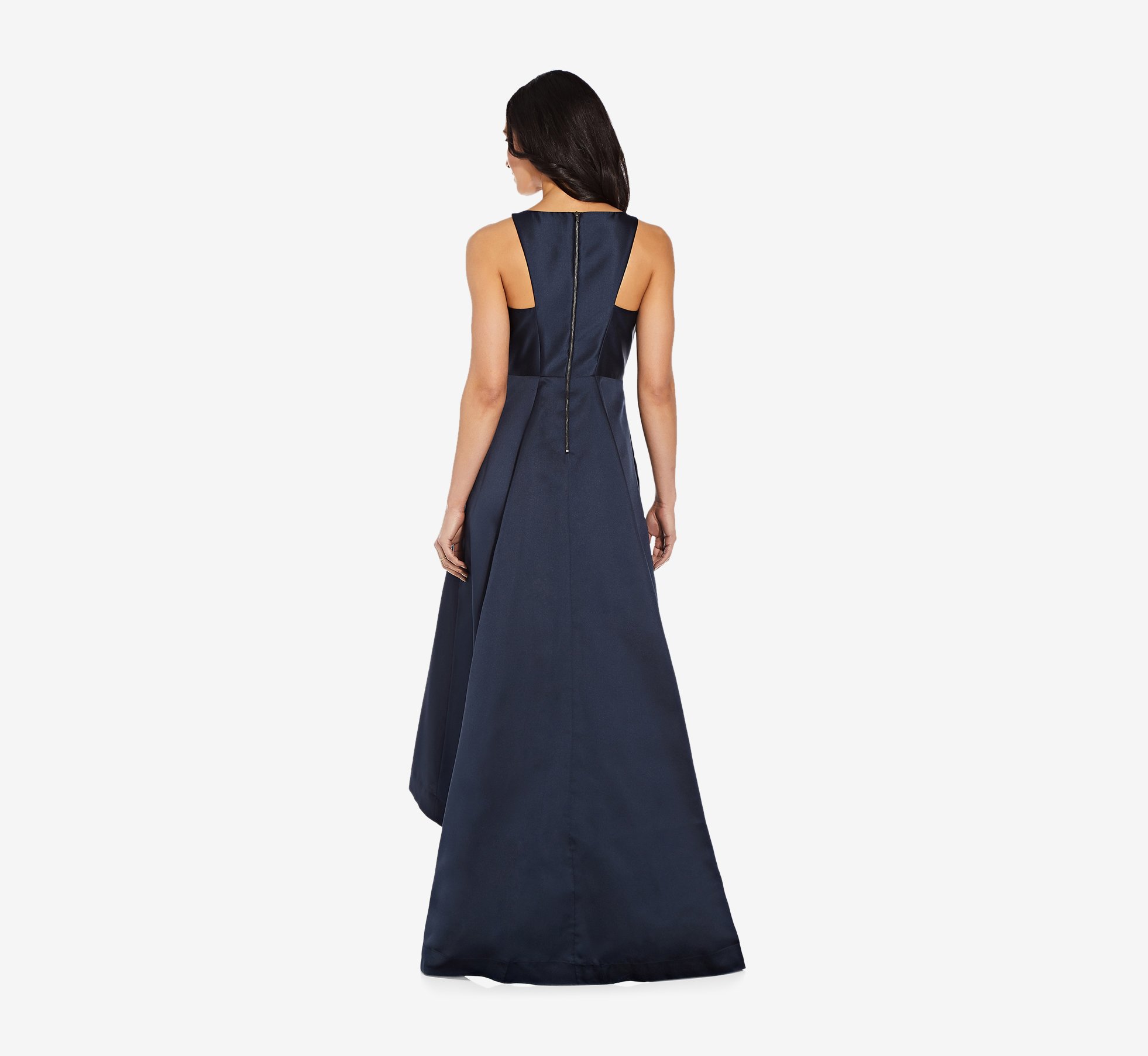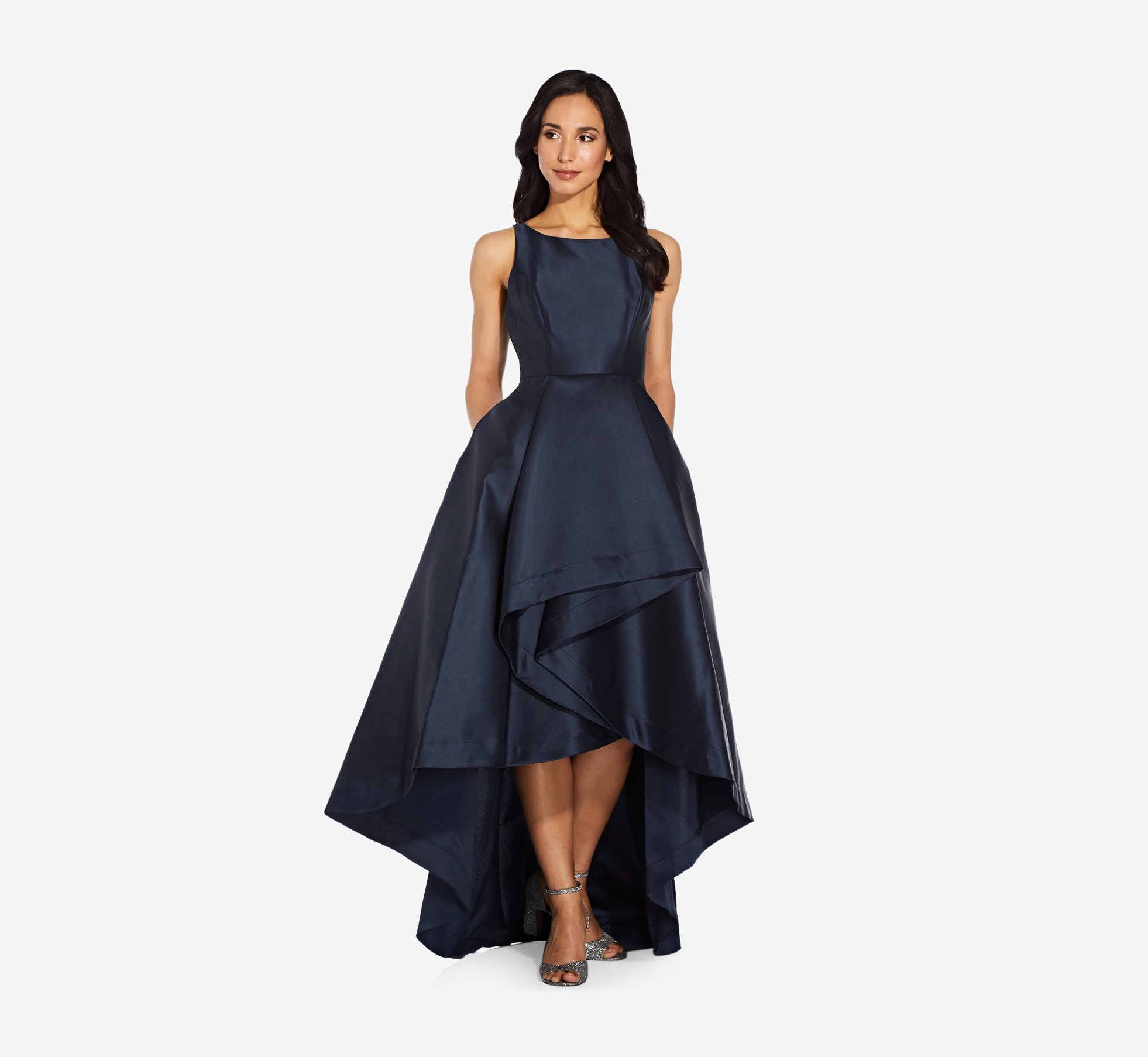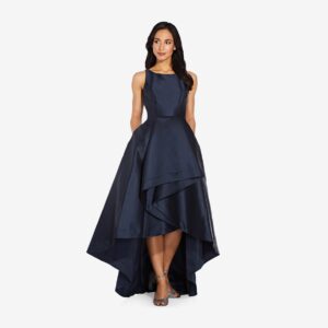 This mikado evening gown features an elegant ball gown silhouette with a tiered high-low hemline. This figure-flattering gown has an elegant boat neck and racer-style back. This design is fully lined and features an exposed back zipper and discreet pockets. The high low skirt offers an asymmetrical, layered design. Style this gown with sparkling high heels and a beaded handbag.