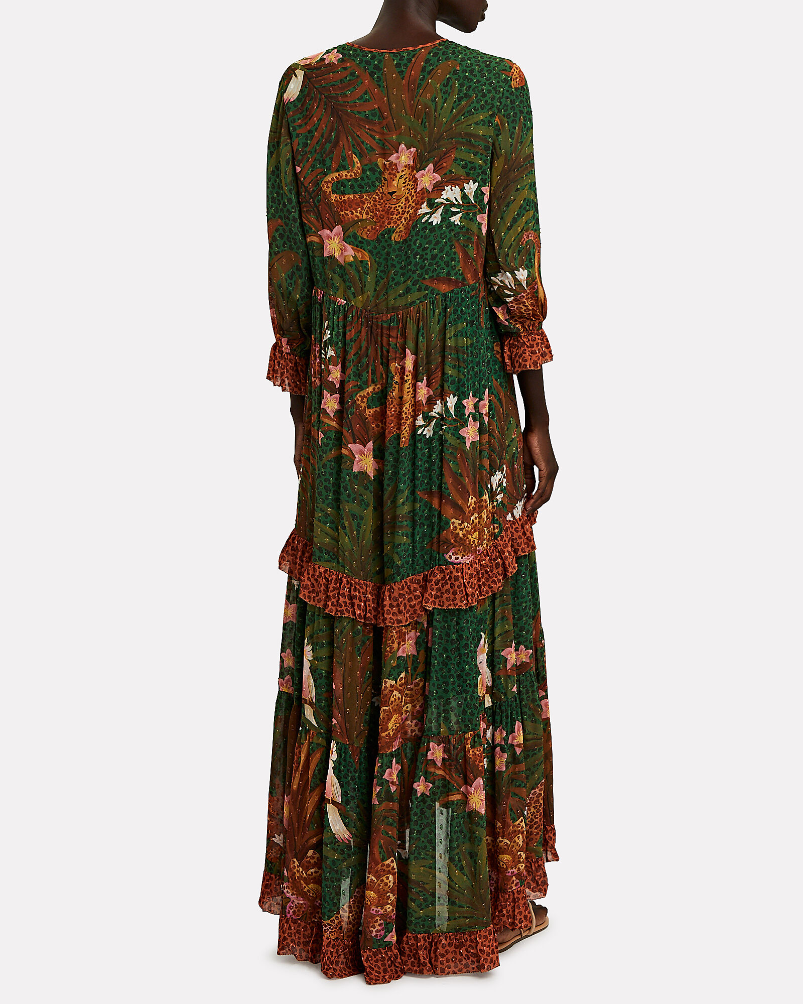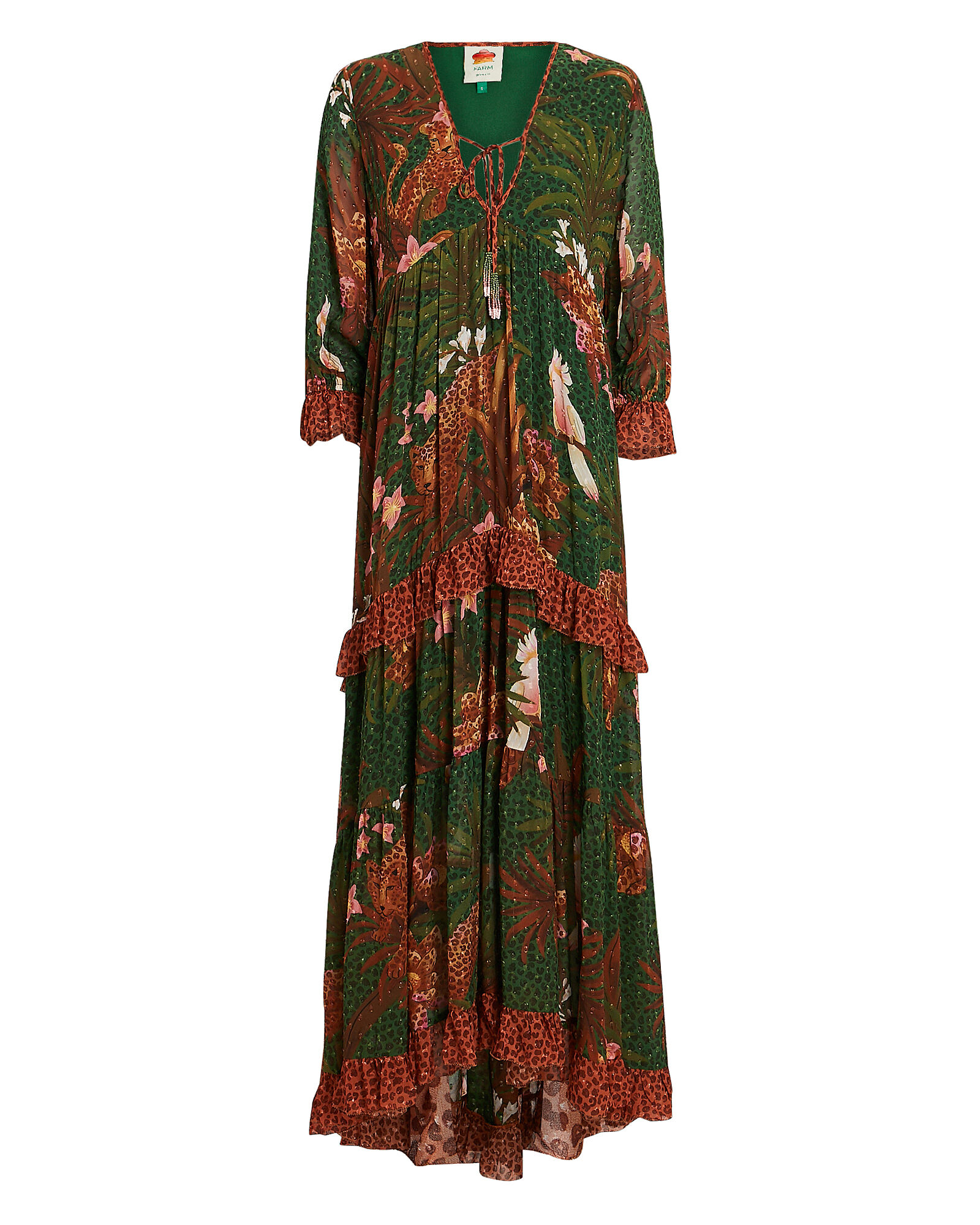 Falling in ruffled tiers, the label’s Wild Leopards maxi dress is tailored in leopard-spotted tropical animal print chiffon for a relaxed kaftan silhouette. Keyhole neck tie closure. Pull-over style.