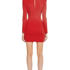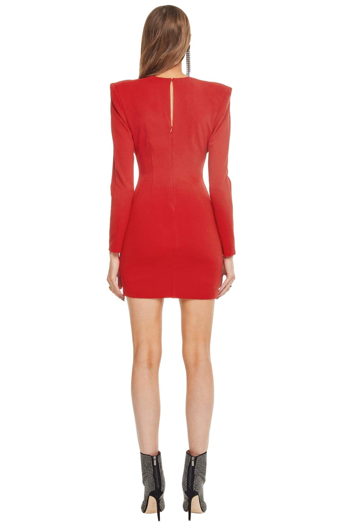 Bodycon dress with a plunging neckline, bold padded shoulders and a keyhole back. Long sleeves. Shortened hem.