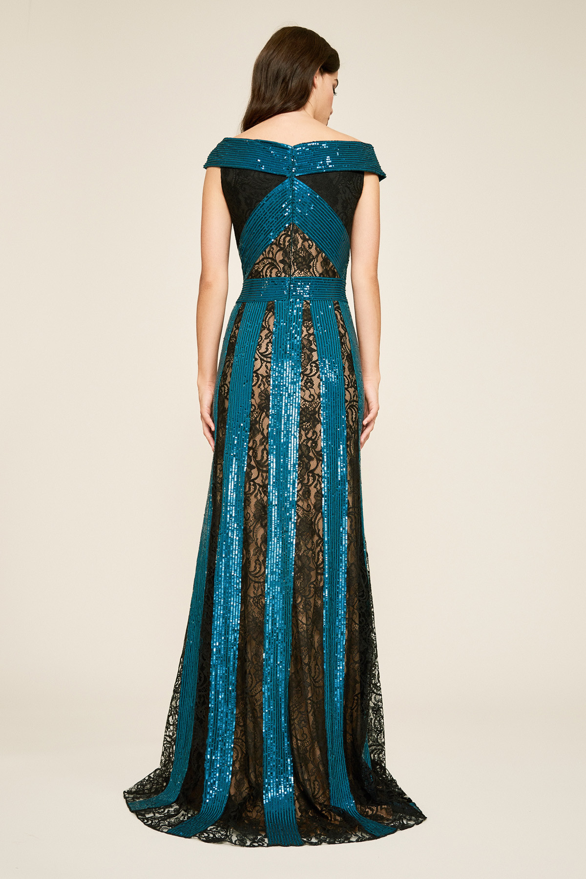 Intricate piecework, light-catching paillettes, and a glamorous décolletage-emphasizing neckline are at once captivating on this sequin and lace gown. Tailored jersey lining. Center back invisible zipper.