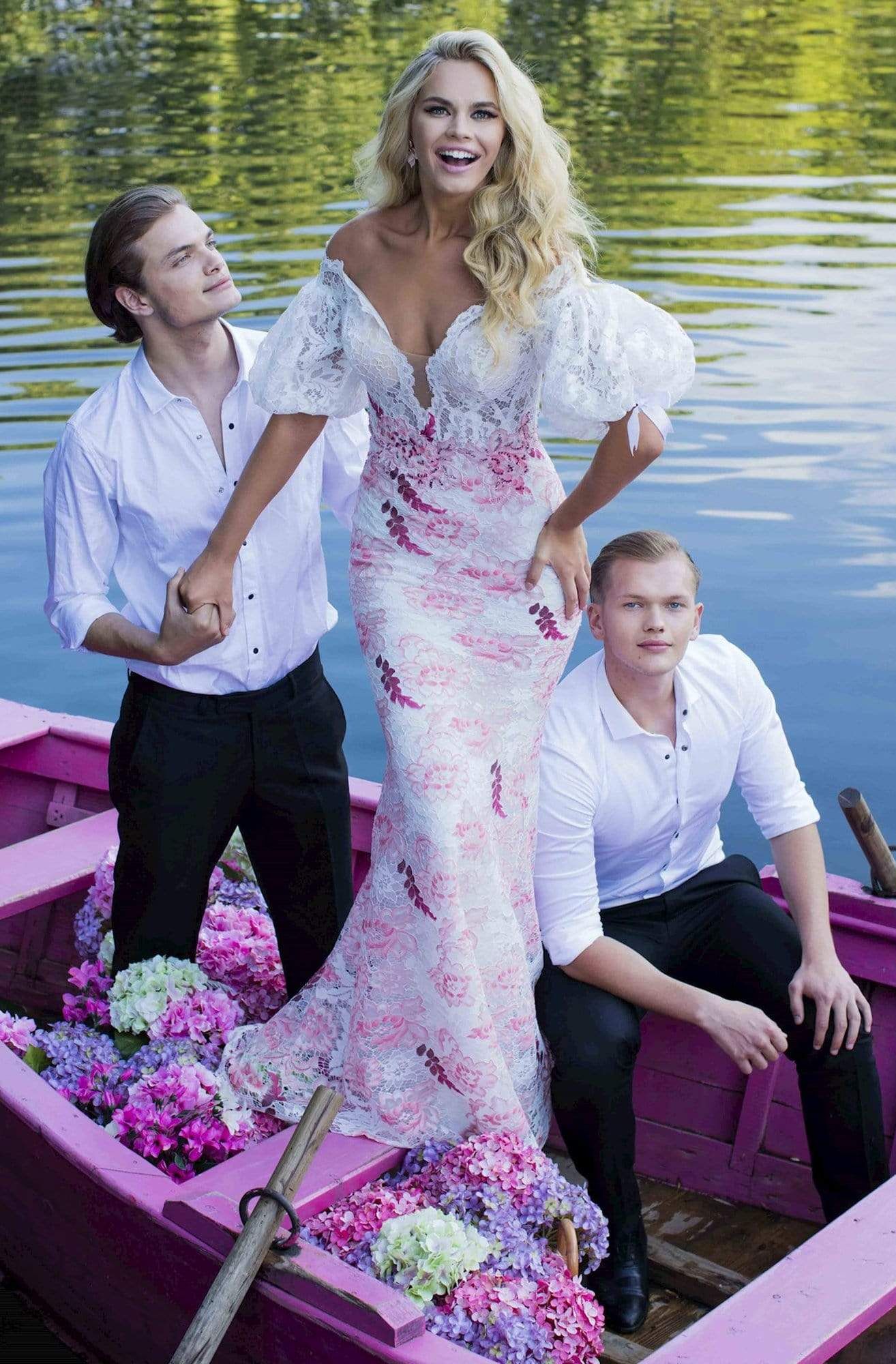 Strike a stunning pose wearing this gown by Tarik Ediz. The gown starts off with a fitted bodice and flows in fit and flare silhouette of a classic mermaid gown. Its design is accented by balloon sleeves and plunging V-neckline. The skirt is decked with floral print and tone-on-tone sequins. Style it with high heels and minimal jewelry for a graceful appeal.