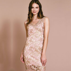 An allover embroidered pattern with metallic cording modernizes a classic silhouette. Custom embroidered edging trims the V-neckline and hem while the lining ends at the thigh to create an alluring, just above the knee hemline. “