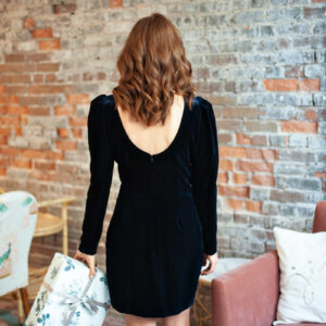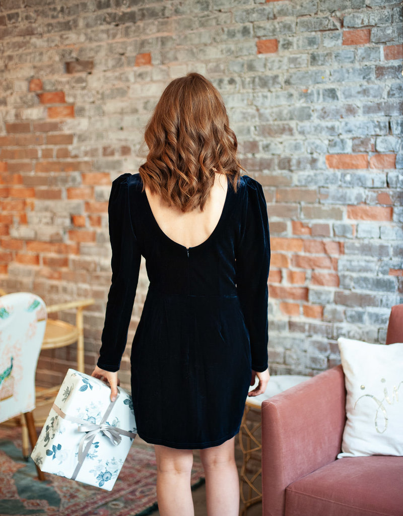 This little navy velvet stunner is perfect for your next Holiday Party – with it’s keyhole neckline, fashion-forward puffed sleeves, low back and mini hemline you will turn all the heads!