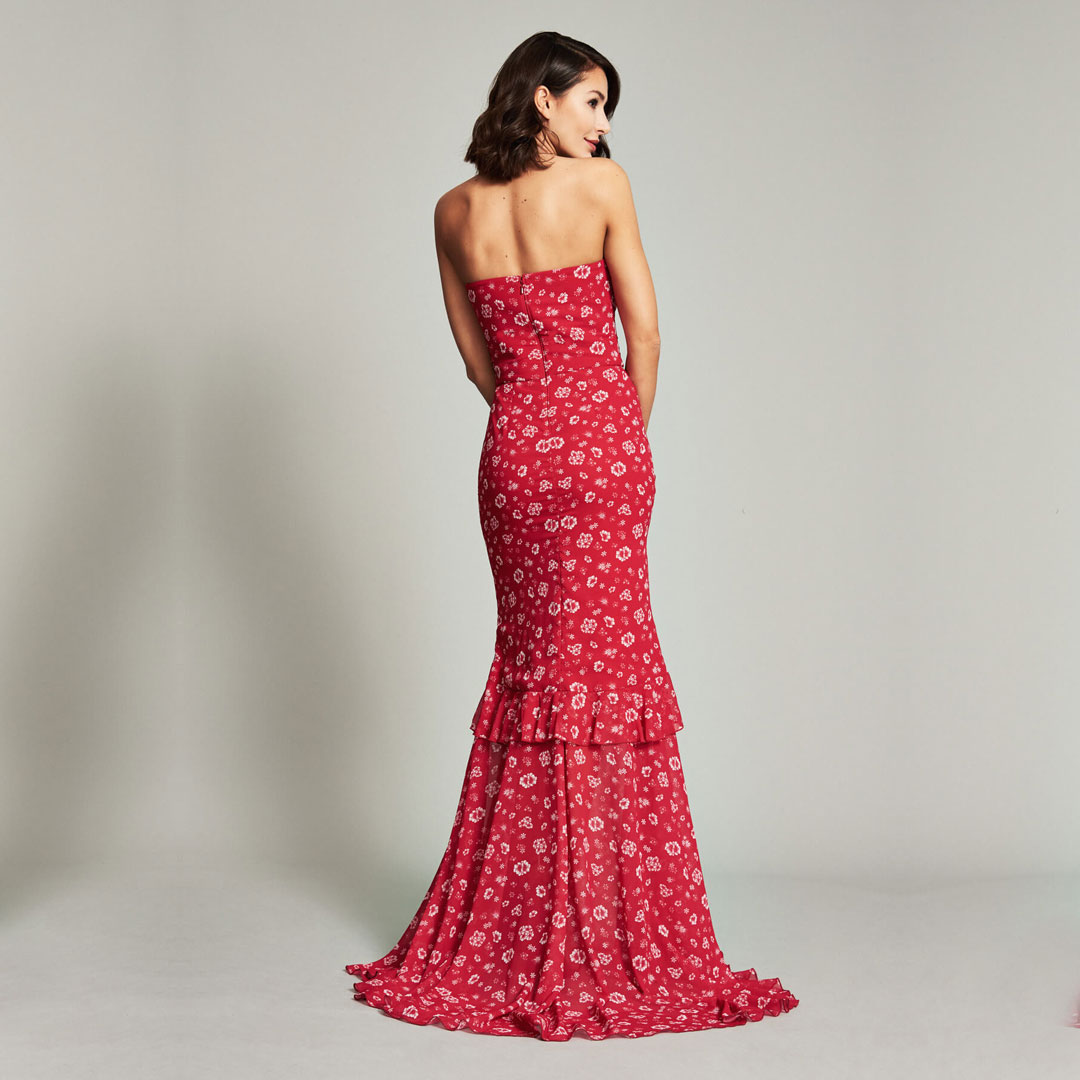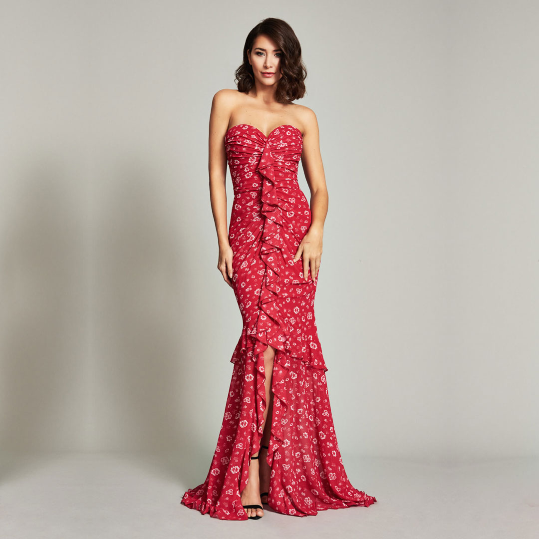 This printed georgette gown hugs curves in all the right places. A draped bodice and cascading ruffles accentuate an hourglass figure while the sweetheart neckline and front slit add to the mermaid silhouette’s refined allure.