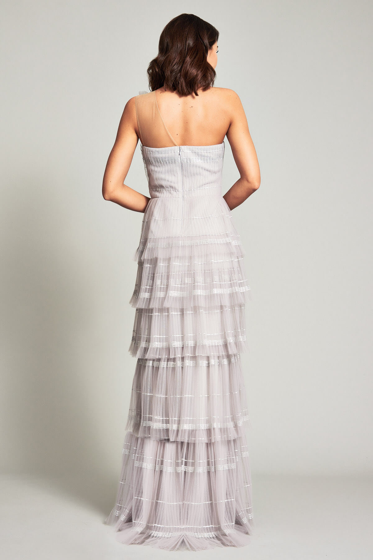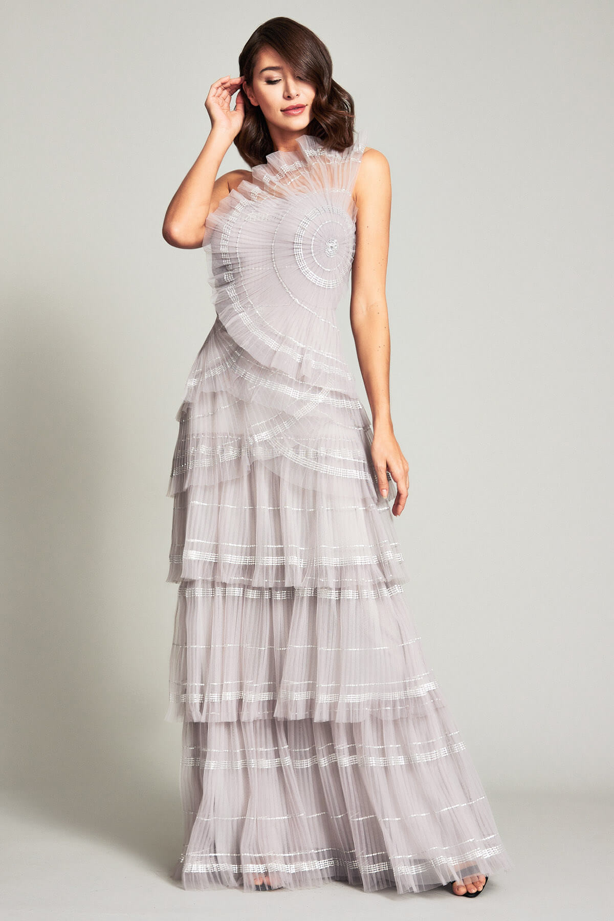 This micro-pleated tulle gown features a light and airy bodice shaped like an open fan and a tiered skirt accentuated with shimmering stripes of mini metallic paillettes. Beneath the tulle, a tailored jersey lining creates the perfect fit.