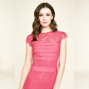 Timeless style is romanced by sport evident in grosgrain-elastic detailing, scalloped lace accents, and a fit-and-flare fit. This lace dress has a boatneck, tapered cap sleeves, and a soft jersey lining.