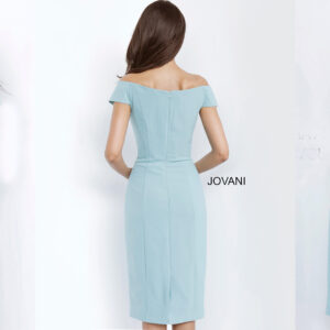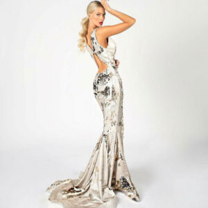 LIGHT BLUE HALTER SCUBA SIDE RUFFLE GOWN