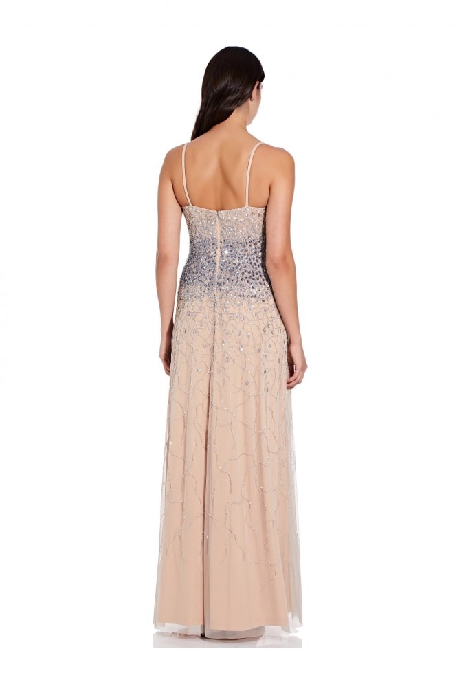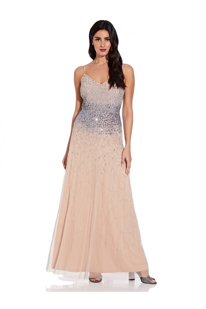 This silver-nud beaded a-line gown is covered with floral designs, and lined with a design at the waist and middle of both sleeves.