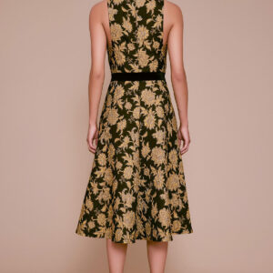 This silver-nud beaded a-line gown is covered with floral designs, and lined with a design at the waist and middle of both sleeves.