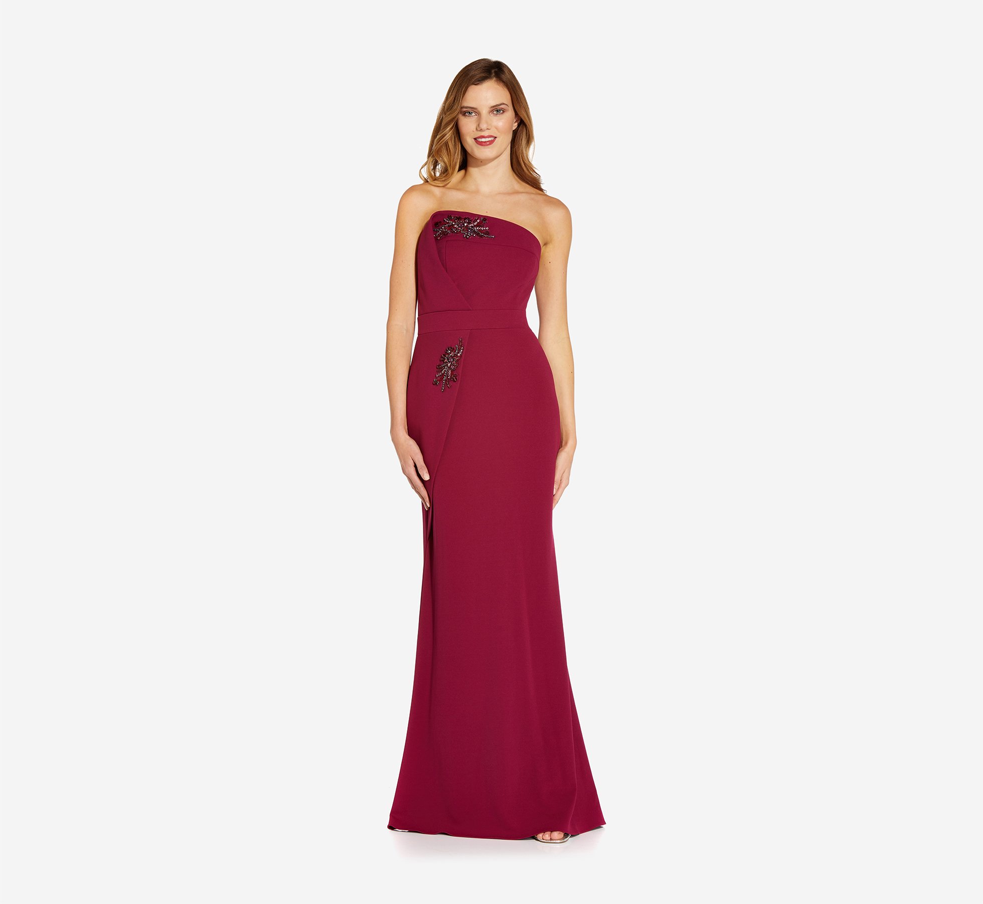 Chic, unique and beautifully understated. Accented with hand-beaded designs, our crepe gown glides effortlessly to every event, in a color that radiates celebration. Wearable all year long—just add a warm cover-up.