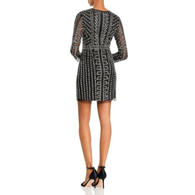 AIDAN MATTOXGeometric Beaded Long-sleeve Mini Cocktail Dress In Black Pearl