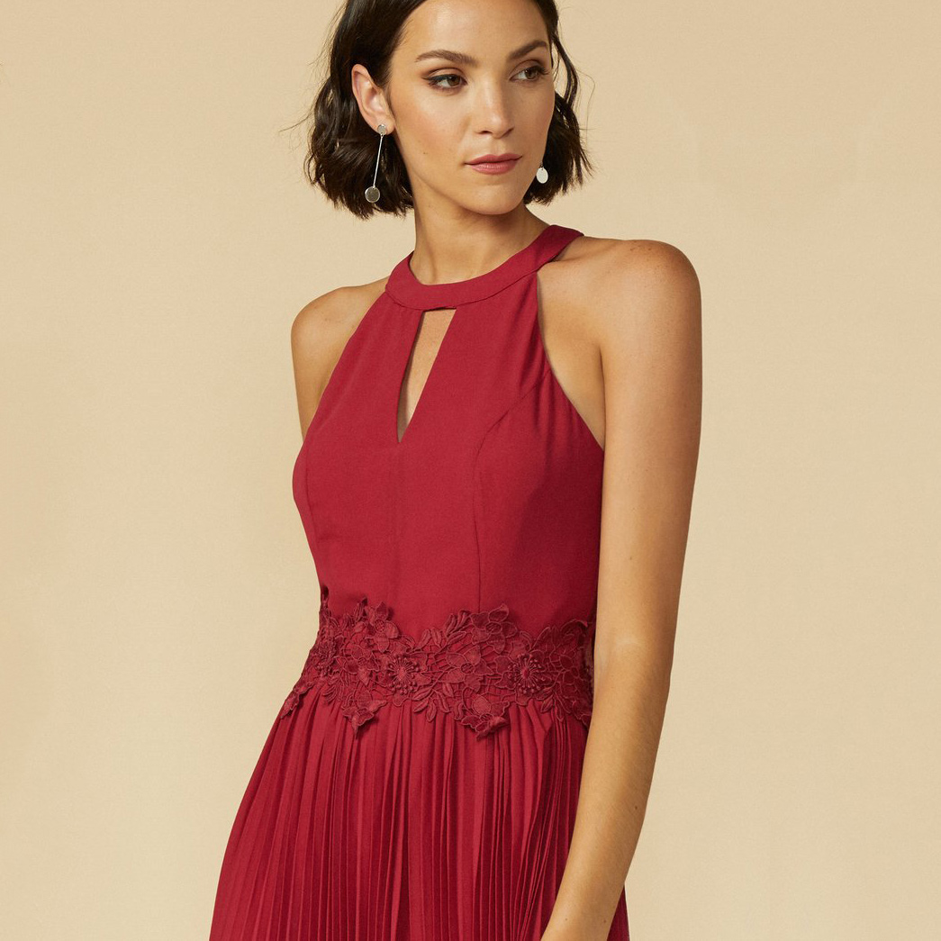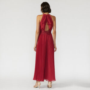 Cuando quieras lucir espectacular, no puedes equivocarte con un mono de gasa. Ajustada en la parte superior con su cuello halter y cintura con ribete de encaje, la parte inferior de la prenda fluye con su material similar al crepé. Con un hermoso corte en forma de V en el cofre, estás transmitiendo un look divertido y coqueto perfecto para la boda de un amigo o para tomar algo en la bodega.
