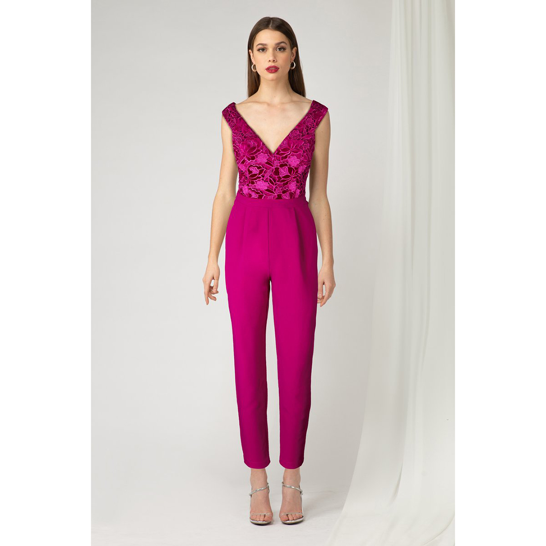 Vibrant color and lush texture define this tapered-leg jumpsuit detailed with velvet-accented guipure lace at the V-neck bodice. 56 “length Hidden back-zip closure V-neck Sleeveless, with cutaway shoulders Front slant pockets V-back Partially lined 100% polyester Hand wash, dry flat.Vibrant color and lush texture define this tapered-leg jumpsuit detailed with velvet-accented guipure lace at the V-neck bodice. 56 “length Hidden back-zip closure V-neck Sleeveless, with cutaway shoulders Front slant pockets V-back Partially lined 100% polyester Hand wash, dry flat.