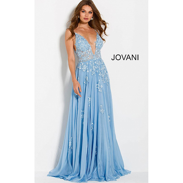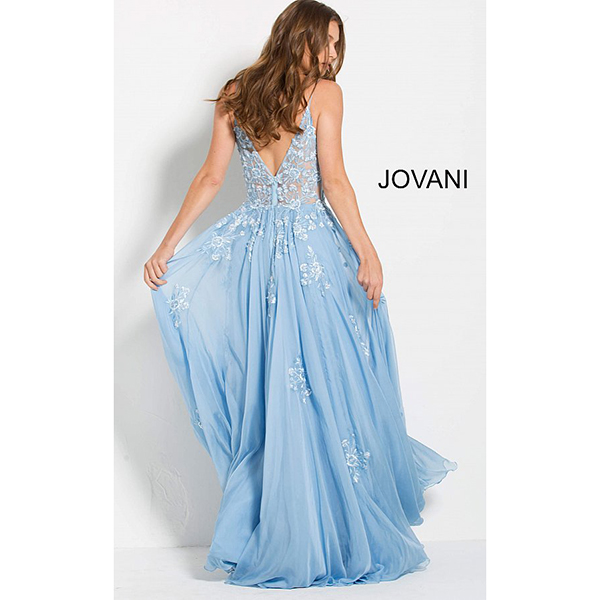 Embellished with intricate lace appliques on the bodice, this is an enchanting evening gown by Jovani fashion house. Plunge V-neck and open back add sensuous tone to the gown. Its graceful design is highlighted by flowing sheer sheath pattern and flared fem. The feminine silhouette of this ravishing dress can be paired with high-heel glitter or sequined pointed-toe pumps for a dazzling party outfit.