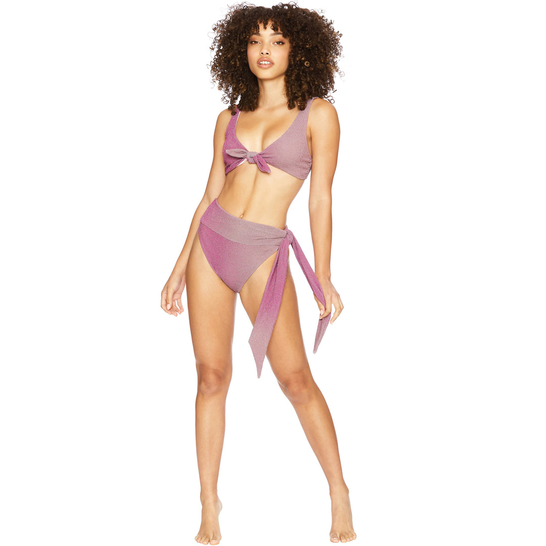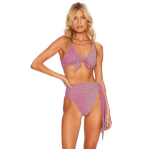 The Grace Top is our tie front swim top. This top is featured in our ombre sparkly pink fabric. It has a scoop neckline and thick straps that provides extra support. Match this top with the Claire Bottom for a standout set.