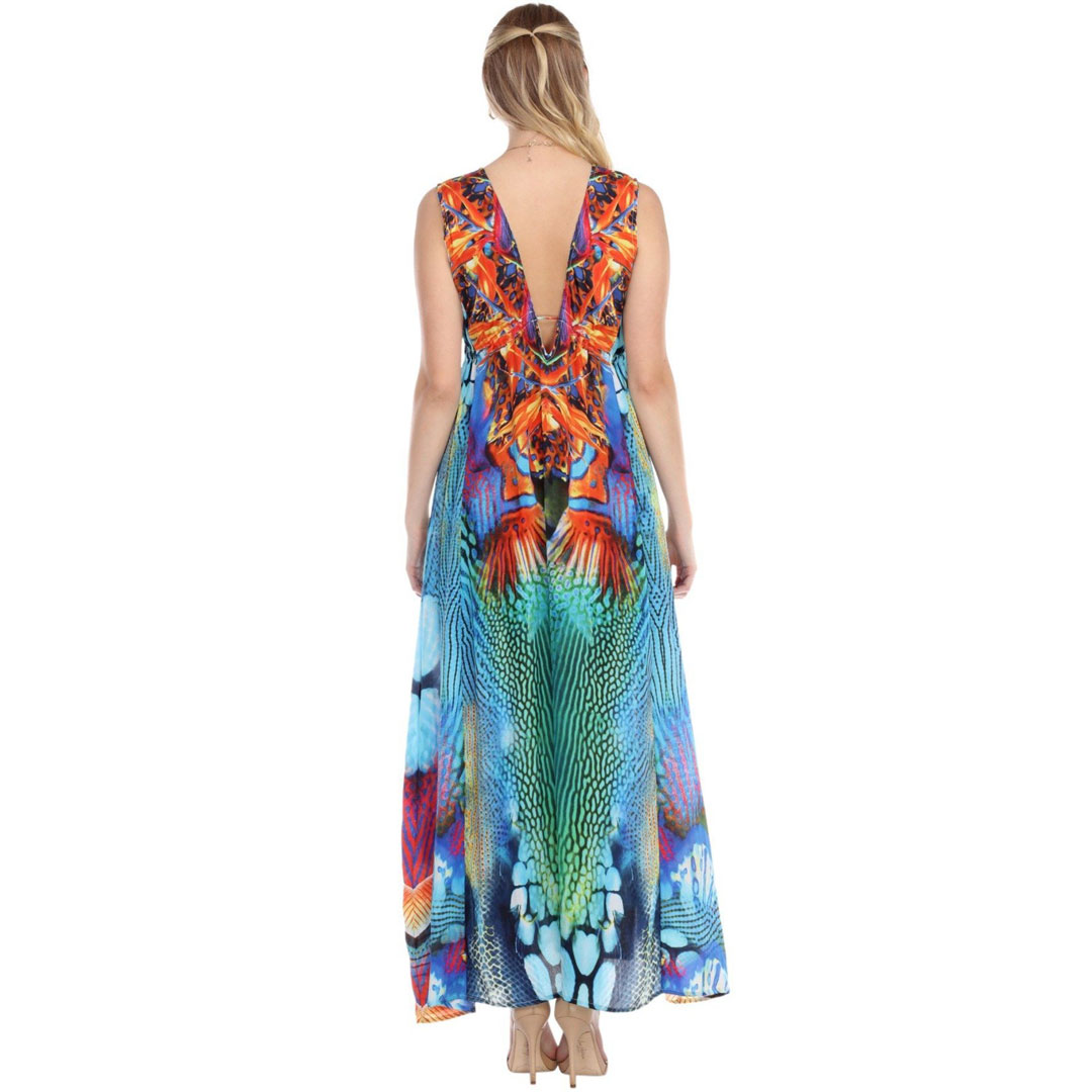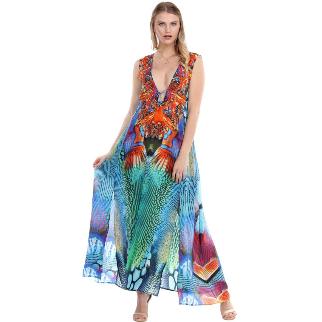 This flowy maxi dress makes sure you keep up with the latest fashion trends. The collection balances ease and elegance in equal measure. Gorgeously designed to flatter the feminine form with high slits, empire waist and plunging neckline, this silk dress will be a head-turner at resorts and beaches. Check out the vibrant colors and designs at Goga Swimwear.
