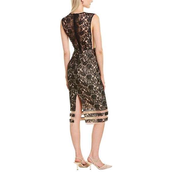 Design Details: Lace Design, Plunge Neck, Illusion Side Panels, And Vented Back Hem