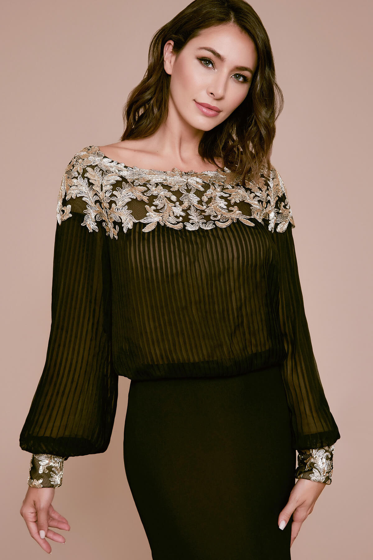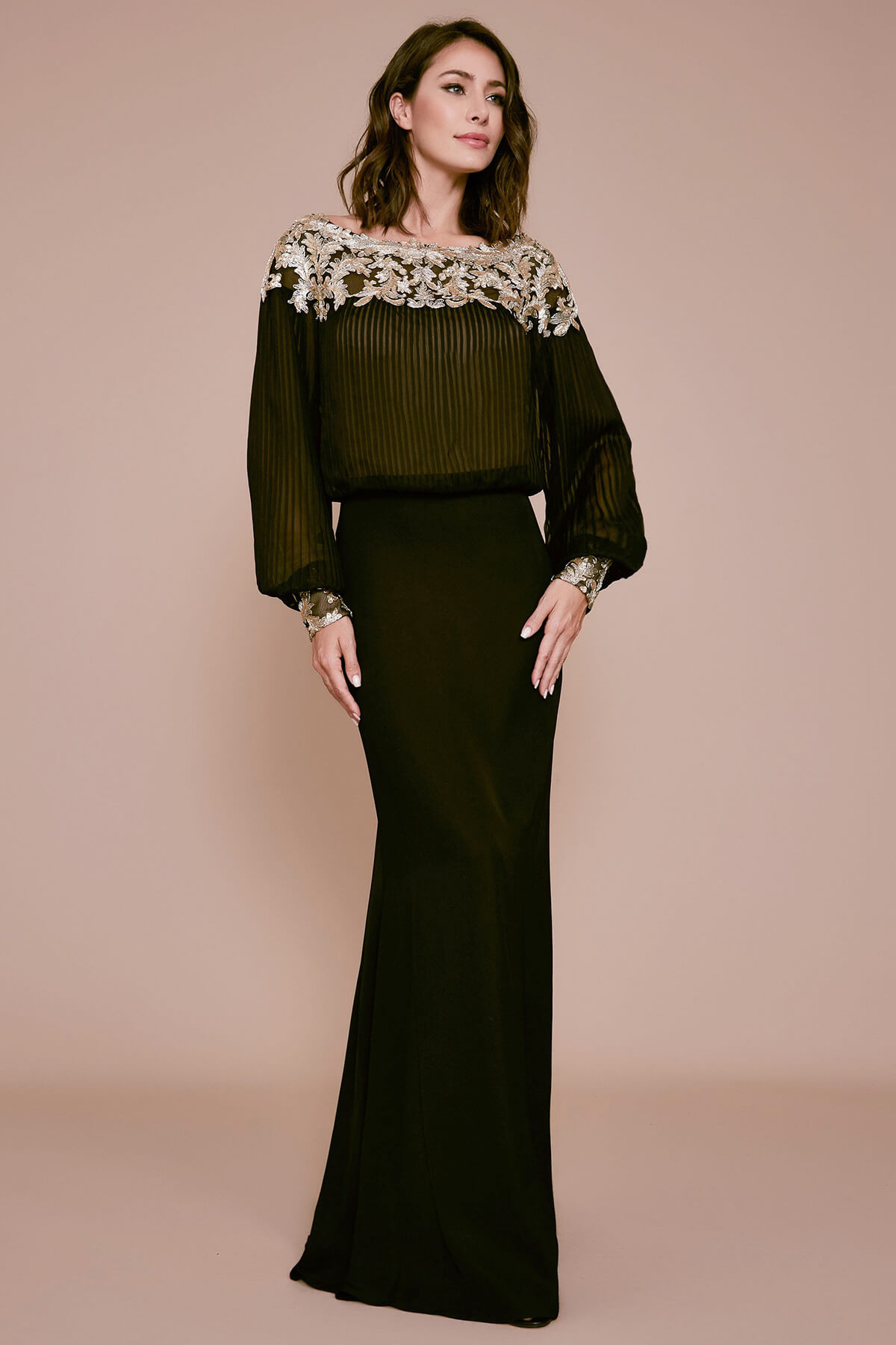 This pleated crinkle tulle and crepe gown oozes understated elegance. It has a bateau neckline embellished with metallic gold embroidery, a blouson waist, and bishop sleeves with embroidered cuffs.