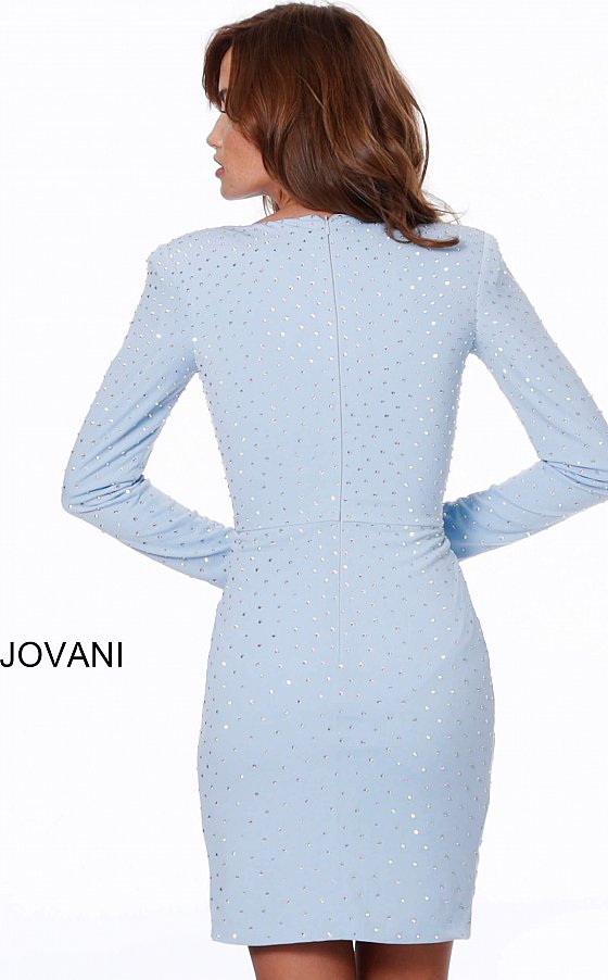 This Jovani 04015 light blue short dress is crafted in beaded jersey, featuring an asymmetrically draped bodice with a plunging V-neckline and long sleeves. This fitted homecoming dress finishes in a faux wrap skirt.