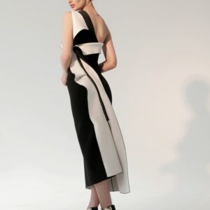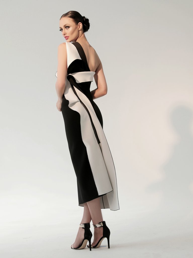 Exhibit exceptional style in this superb evening dress by Nicole Bakti 601. Features a sleeveless, asymmetric neckline. It has a fitted skirt and runs at tea length hem. Dominate this luxurious event as you saunter into the ballroom with sass and allure in this chic Nicole Bakti look.