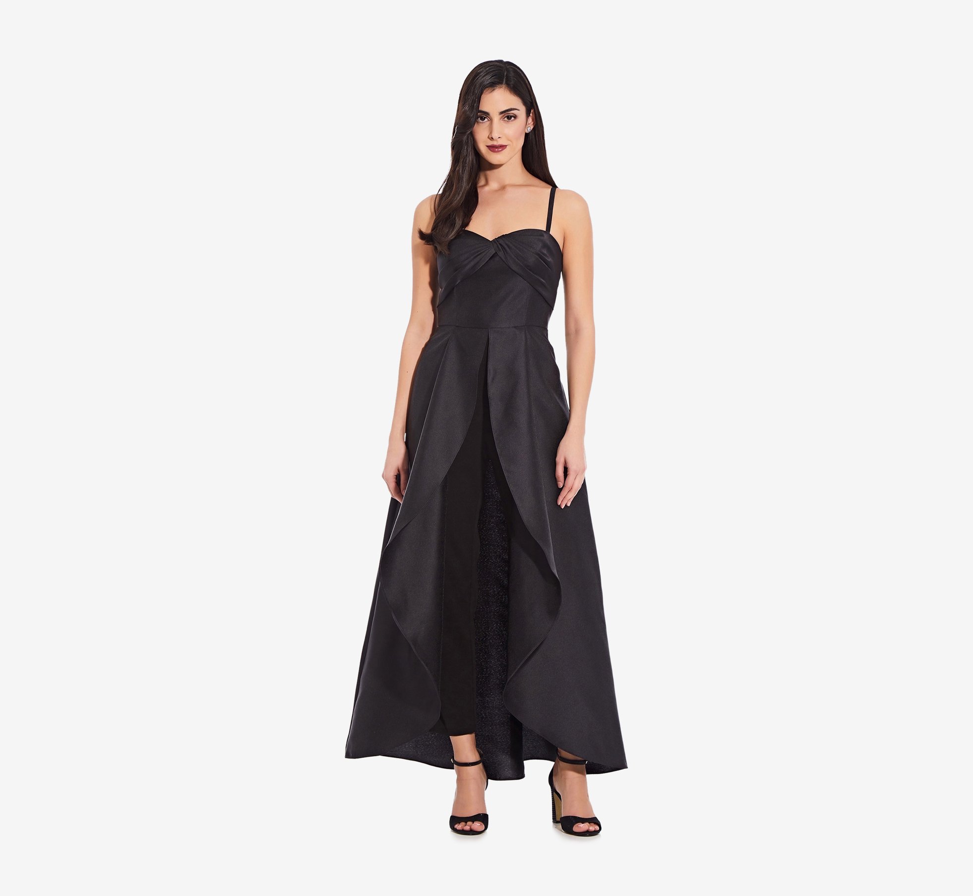Fashion-forward and fabulous, this daring jumpsuit is bound to steal the show. Take on your next big night in style when you rock this trendy asymmetrical jumpsuit, which features thin, spaghetti straps, a beautiful bandeau bodice, and a long, asymmetrical high-low skirt with tapered pants underneath. The back of this jumpsuit features a back zipper closure. Combine this trendy and totally chic jumpsuit with sparkling statement earrings, a sleek clutch, and the perfect pair of strappy heels or pumps to forge an unforgettable look.