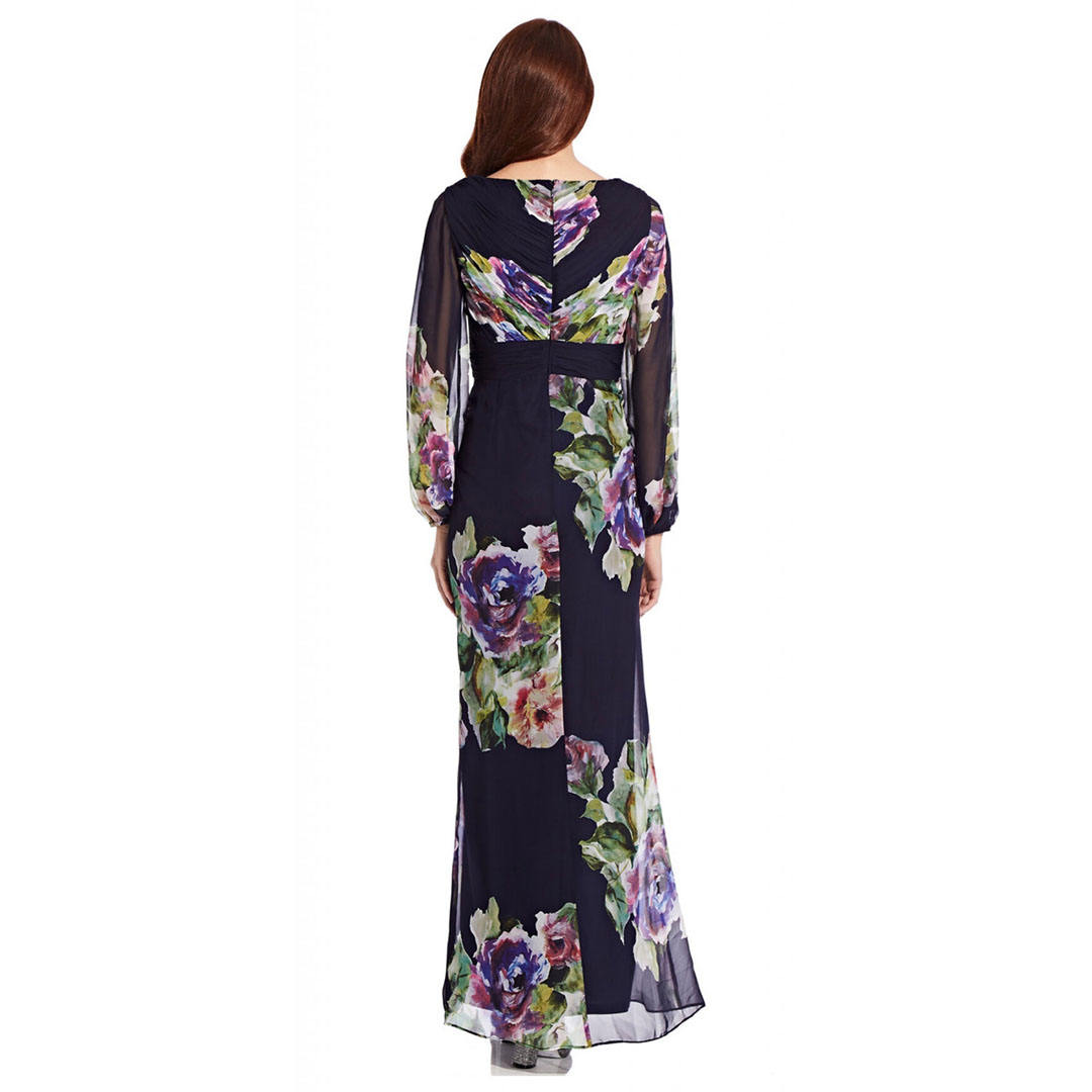Capture that striking presence and get everyone’s attention in Adrianna Papell. Parades in a beautiful floral print, this dress features a ruched V-neckline framed with long sleeves. The skirt falls in floor length with a side slit. A zipper back closure secures the look. This Adrianna Papell will definitely bring out the goddess in you!