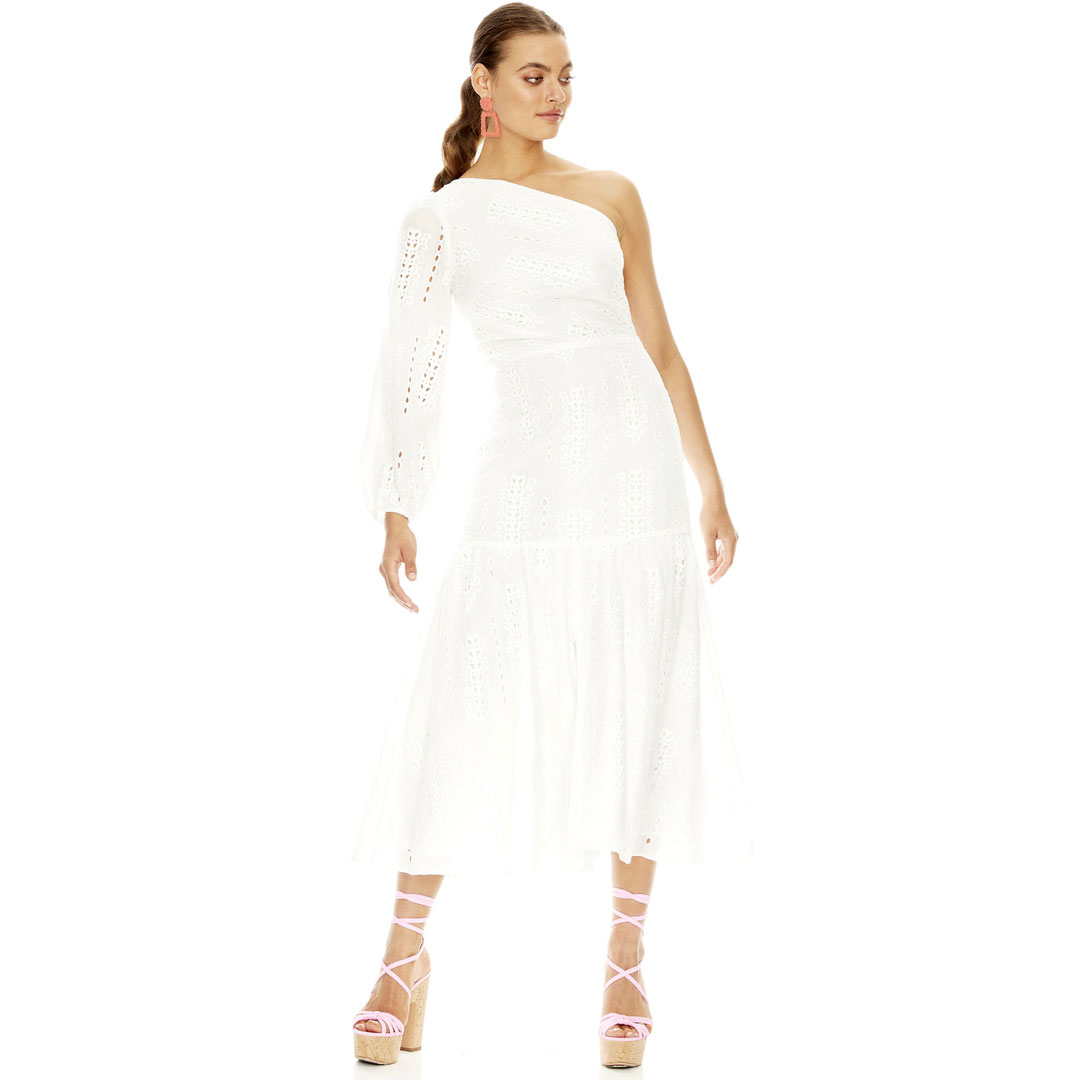 Your go to midi, that you’ll never let go of. This heavenly midi features an asymmetric neckline, ¾ blouson sleeve, a fitted bodice and skirt that flares from the lower hip, all in a stunning embroidery fabrication.