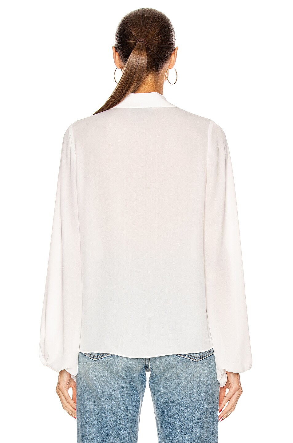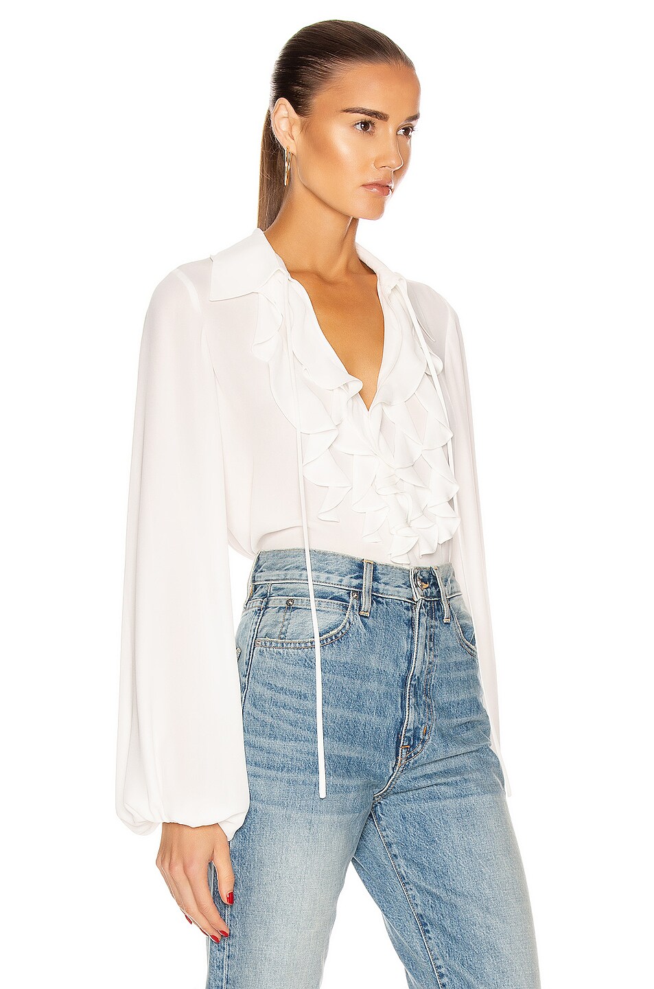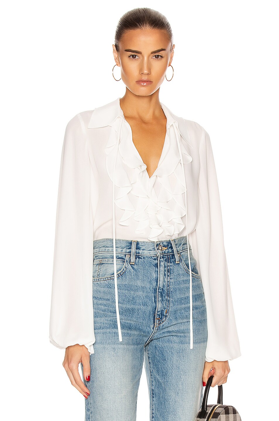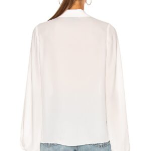 Ruffled neckline. Neck tie detail. Elasticized cuffs. Semi sheer.