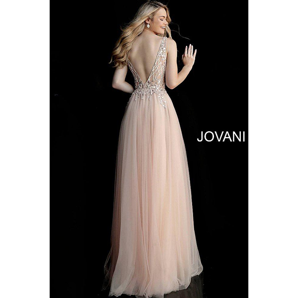 This Jovani 65324 nude prom dress features a gorgeously beaded illusion bodice over a gathered skirt, detailed with a V-neckline, open V-back and overlap slit. This modern A-line gown is crafted in soft tulle.