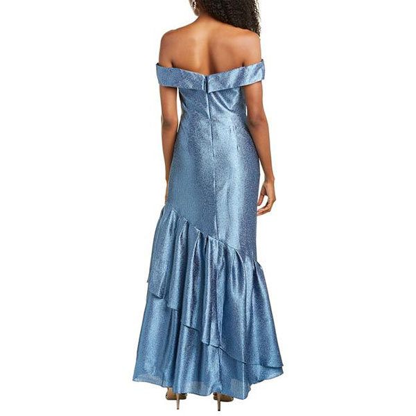Off-the-shoulder gown in textured organza with a satin finish and ruffled hem.