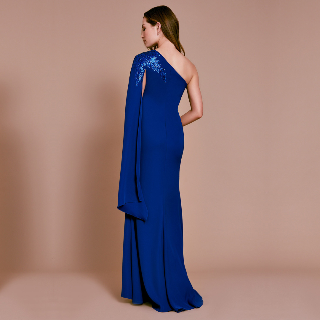 This one-shoulder crepe gown enjoys a natural ease and ethereal prettiness evident in its asymmetric shoulder sash and sparkling embroidery that flows gracefully across the bodice.