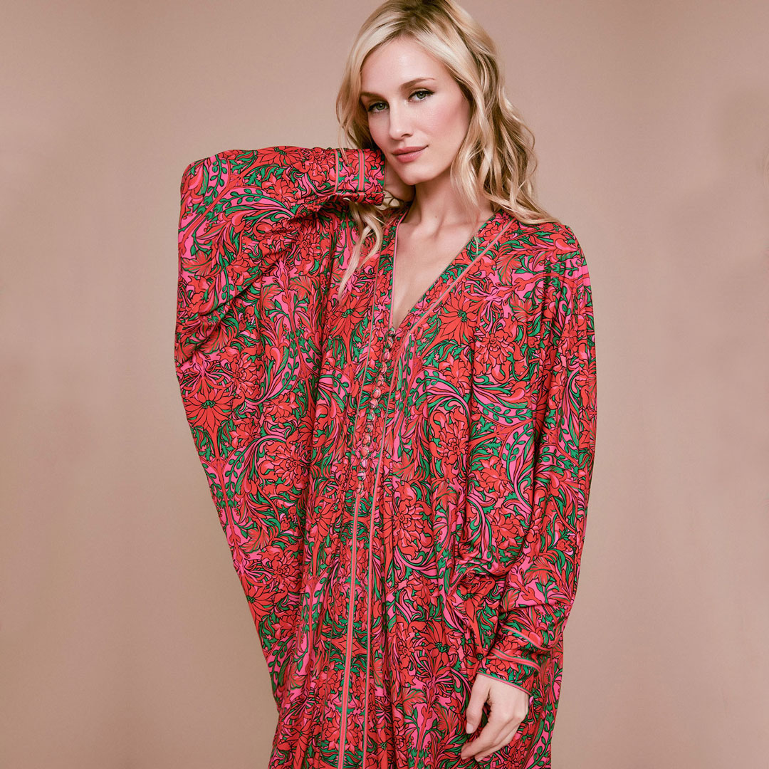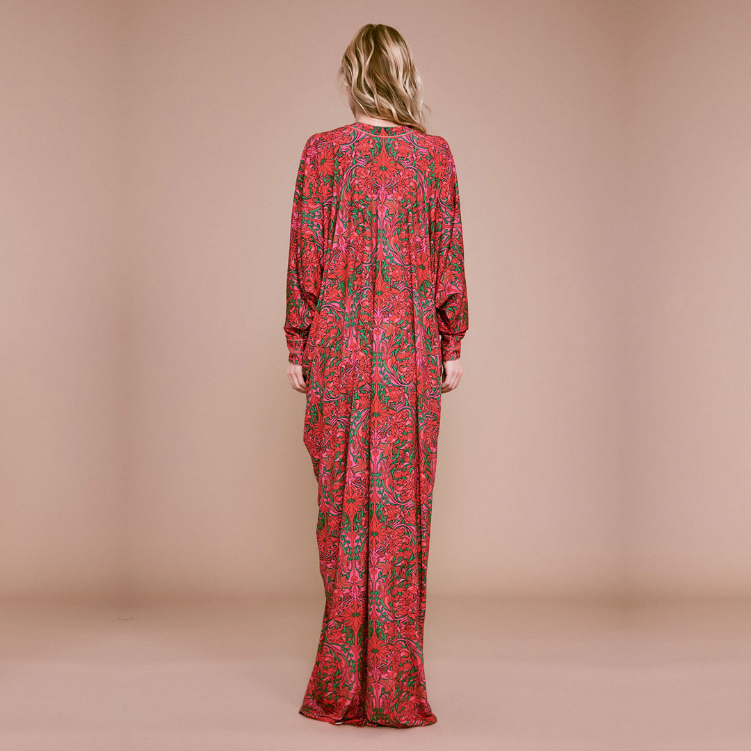 This printed-mesh caftan dress evokes cocoon-like elegance with its draped batwing sleeves, fitted cuffs, and covered buttons.