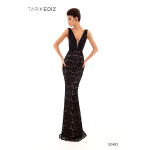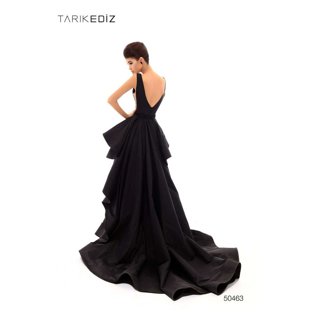 Tarik ediz 50463 the figure-hugging dress features a lacy floor-skimming skirt and a simple black top with a deep-v. The detachable taffeta train is attached with a sparkly belt.