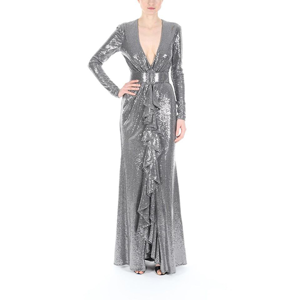 RUNWAY SEQUIN V NECK RUFFLE GOWN