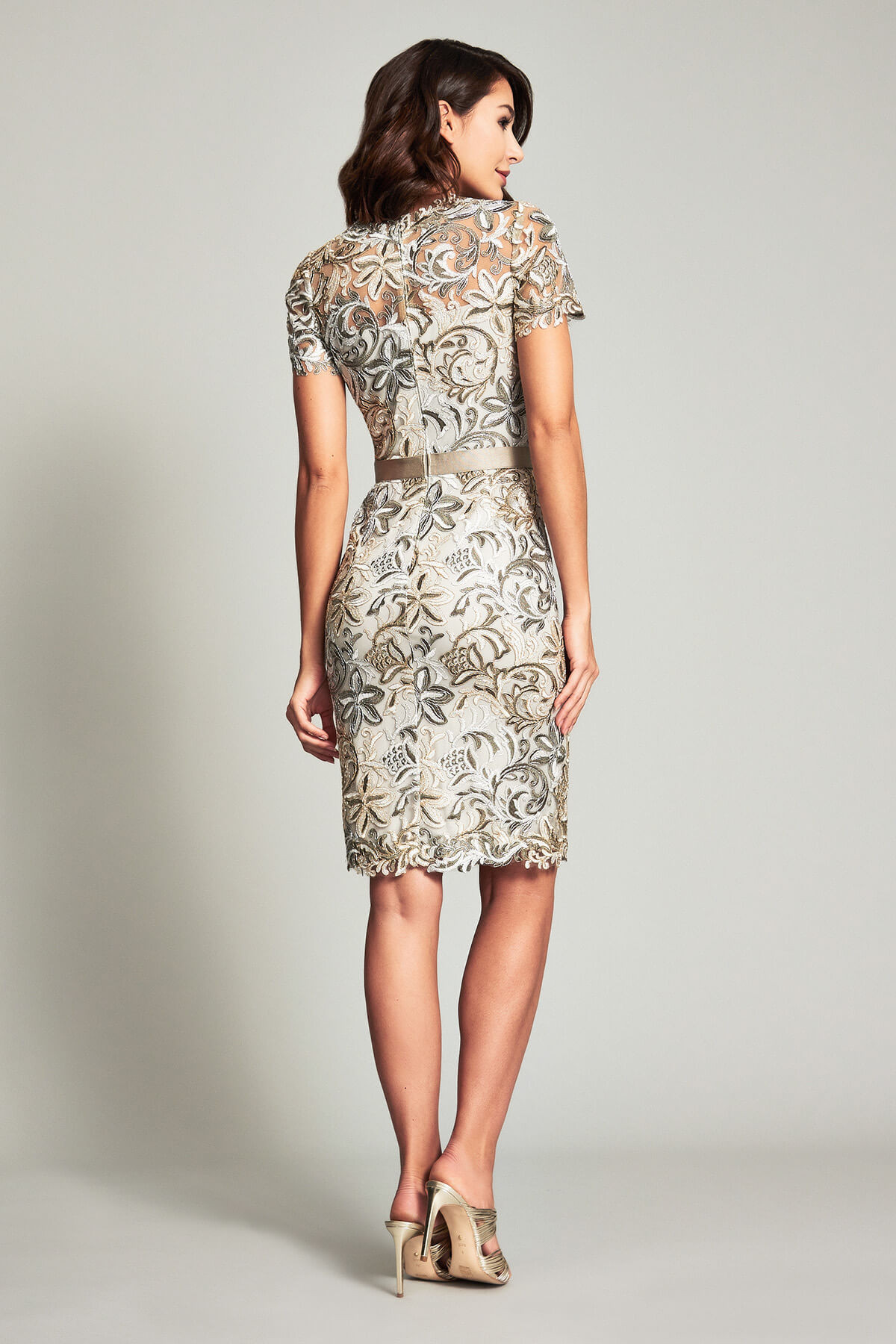 This fitted sheath, crafted from embroidery with metallic cording, is a fabulous choice for your next event. An illusion neckline and sheer short sleeves reveal just enough while still providing coverage, and an attached grosgrain elastic belt accentuates the waistline. Lined in soft, stretch jersey.