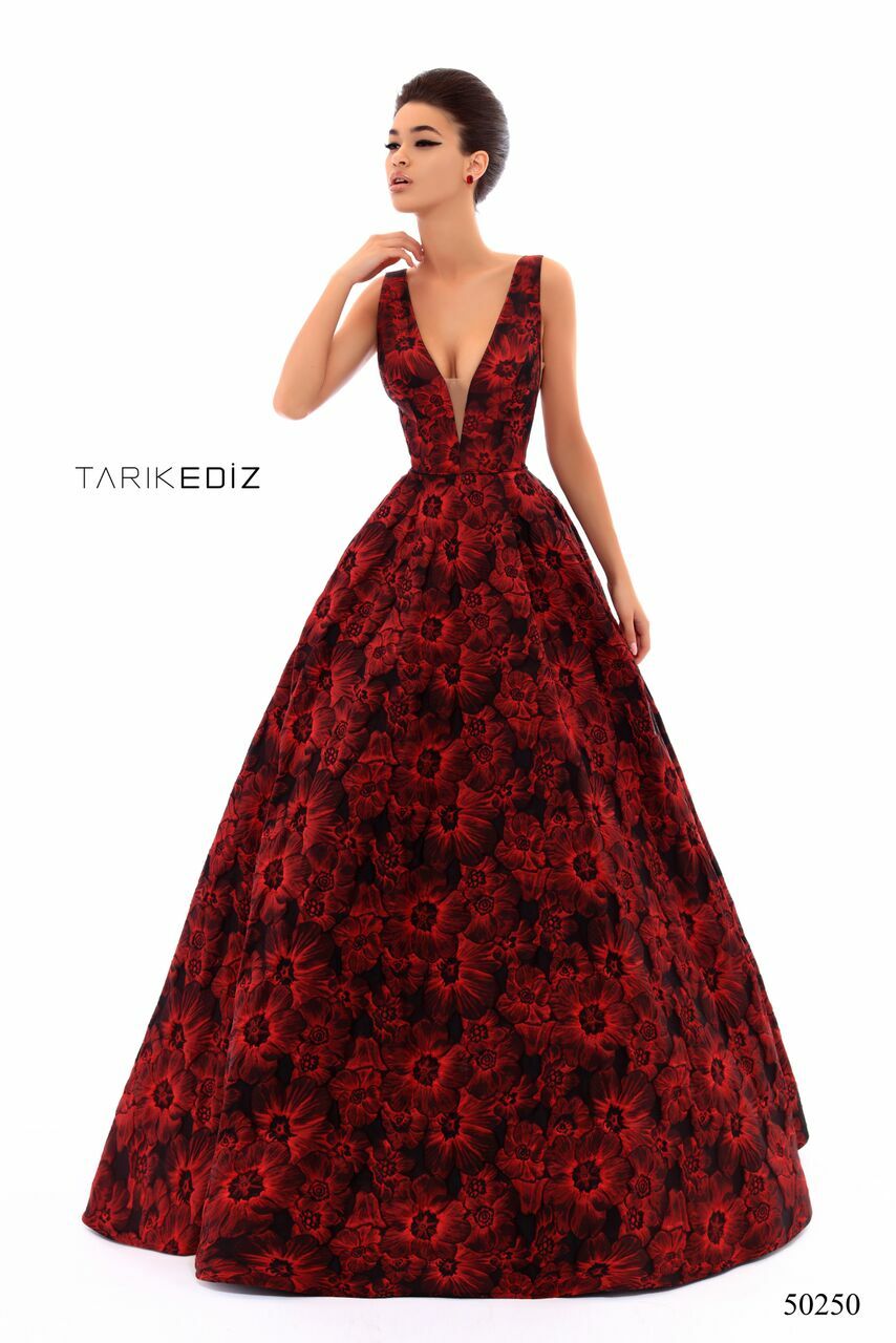 Make yourself into a vision of loveliness in this glamorous creation from Tarik Ediz 50250. This stunner features a fitted bodice with plunging v neckline and comes with modesty inserts on the decolletage and sides. Crafted in floral jacquard, this ballgown dress cascades to a floor length hem. Look sleek and effortlessly beautiful in this Tarik Ediz masterpiece. Model is wearing Burgundy color.