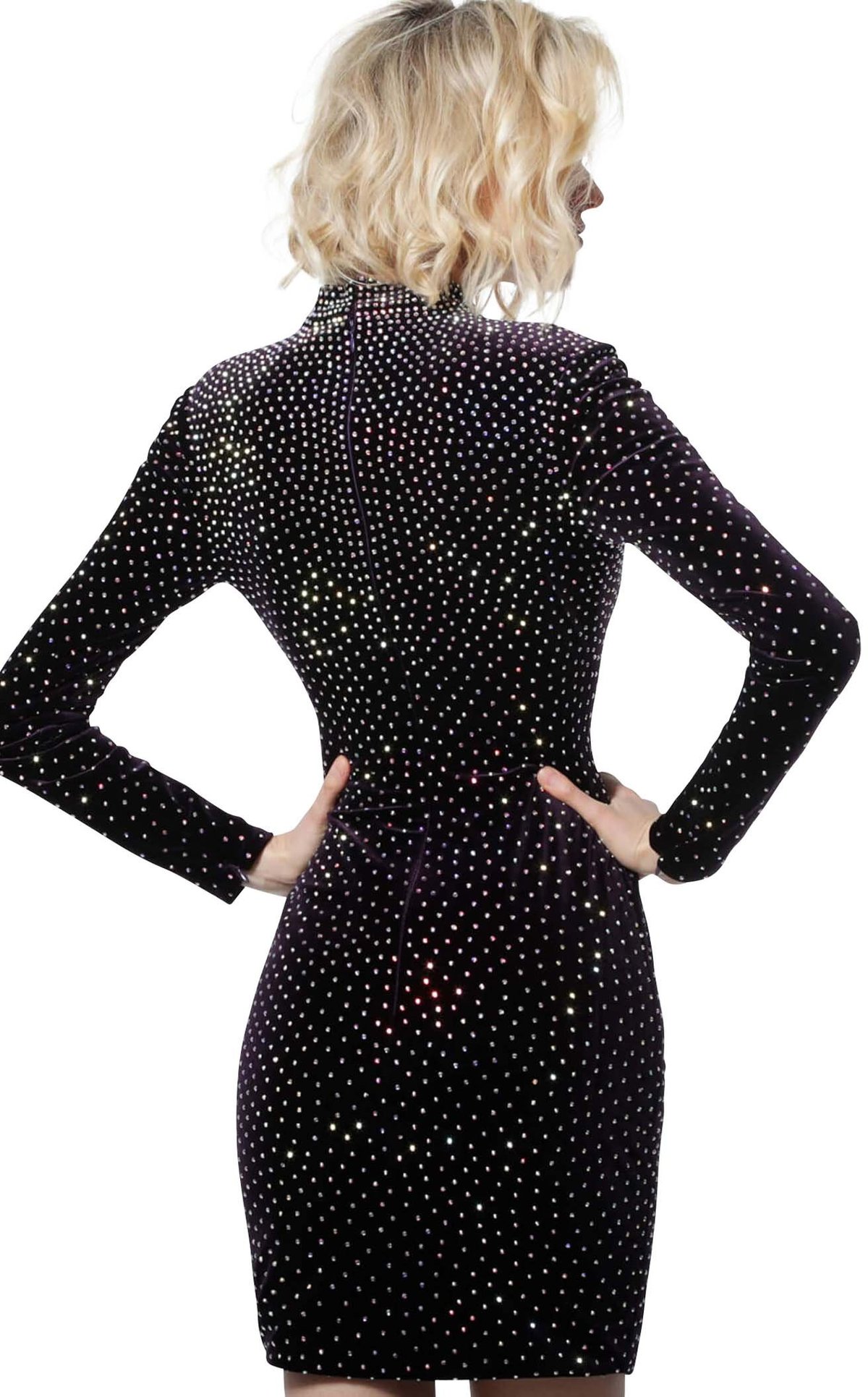 This Jovani 1421 purple short party dress features a fitted silhouette in crystal beaded velvet, with long sleeves to frame the high neckline and full back.