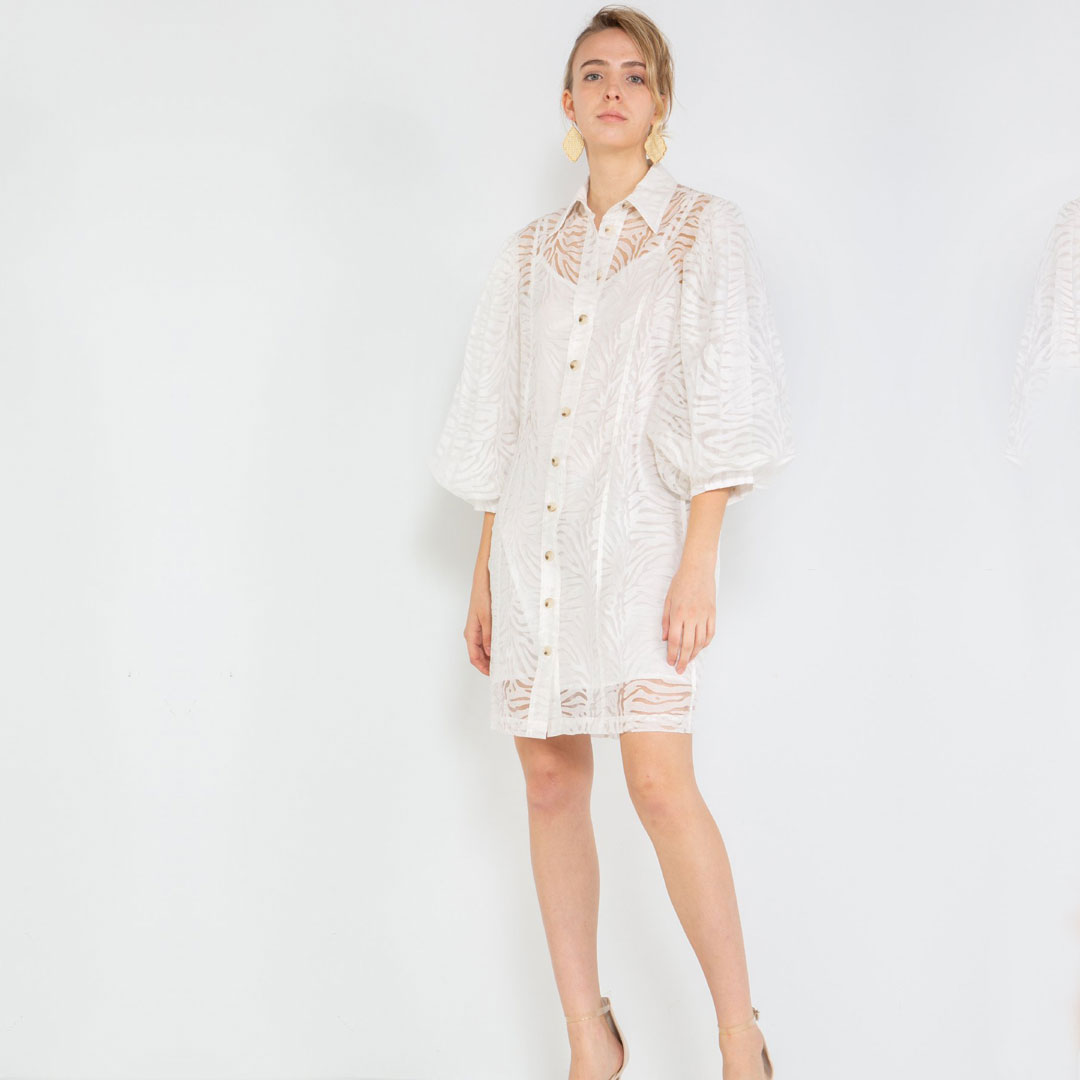 Discounted Products Are Not Returnable. Dress With 3/4 Length Bishop Sleeves. Features A Basic Collar And Button Down Front. Has Seperate Lining.